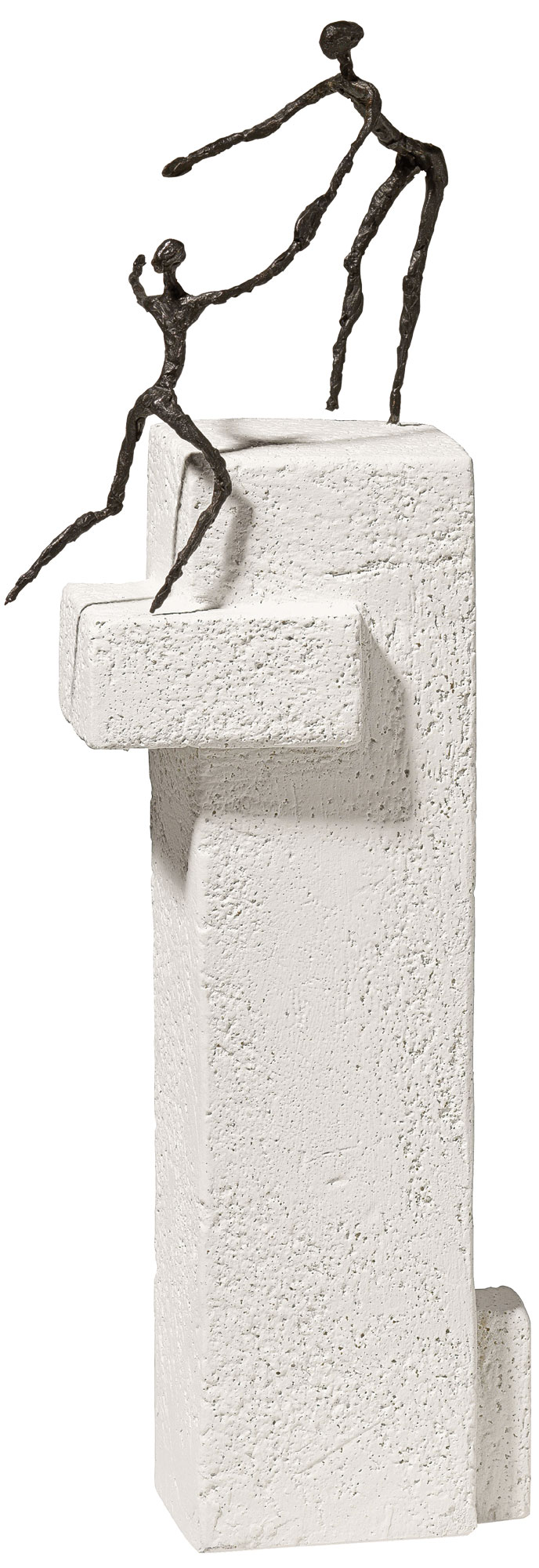 Zu zweit geht alles besser: 'Es macht Freude, einem anderen Menschen zur Seite zu stehen und erfüllt uns mit Freude und Dankbarkeit, Hilfe zu erfahren'. So beschreibt die Künstlerin ihr neues Meisterstück. Kleinplastik aus feiner Bronze, von Hand patiniert und gewachst. Höhe inklusive Steinguss-Sockel 39 cm. Lieferung mit Expertise. ars mundi-Exklusiv-Edition.