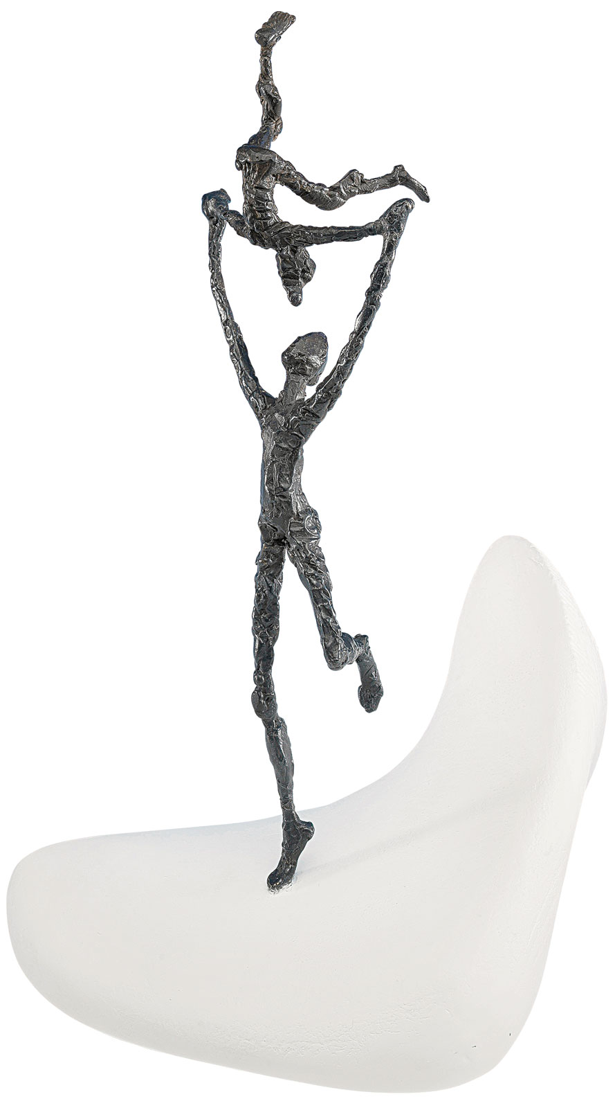 Motivations-Kunst mit Erfolgsgarantie: Die expressiven Bronzeobjekte von Luise Kött-Gärtner. Im Spiel wird der Mensch erst Mensch - das wusste schon Schiller. Im ungezwungenen Spiel fällt alles Schwere von ihm ab, der Mensch fühlt sich frei. Die Skulptur besticht durch ihre Dynamik, dem tiefen Kontrast zwischen dunkel patinierter Bronze und hellem Steinguss-Sockel. Kleinplastik aus feiner Bronze, von Hand patiniert und gewachst. Format inklusive Steinguss-Basis 26 x 18 x 14 cm (H/B/T). Lieferung mit Expertise.