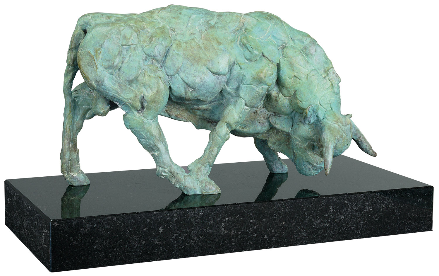 Alle Muskeln angespannt, den Kopf tief zum Angriff gebeugt: Martin Pottgiessers Stier strotzt vor Kraft.Edition in Bronze, gegossen im Wachsausschmelzverfahren, von Hand ziseliert und patiniert. Limitierte Auflage 49 Exemplare, nummeriert und signiert. Format 17 x 30 x 14 cm (H/B/T). Gewicht 7,4 kg.