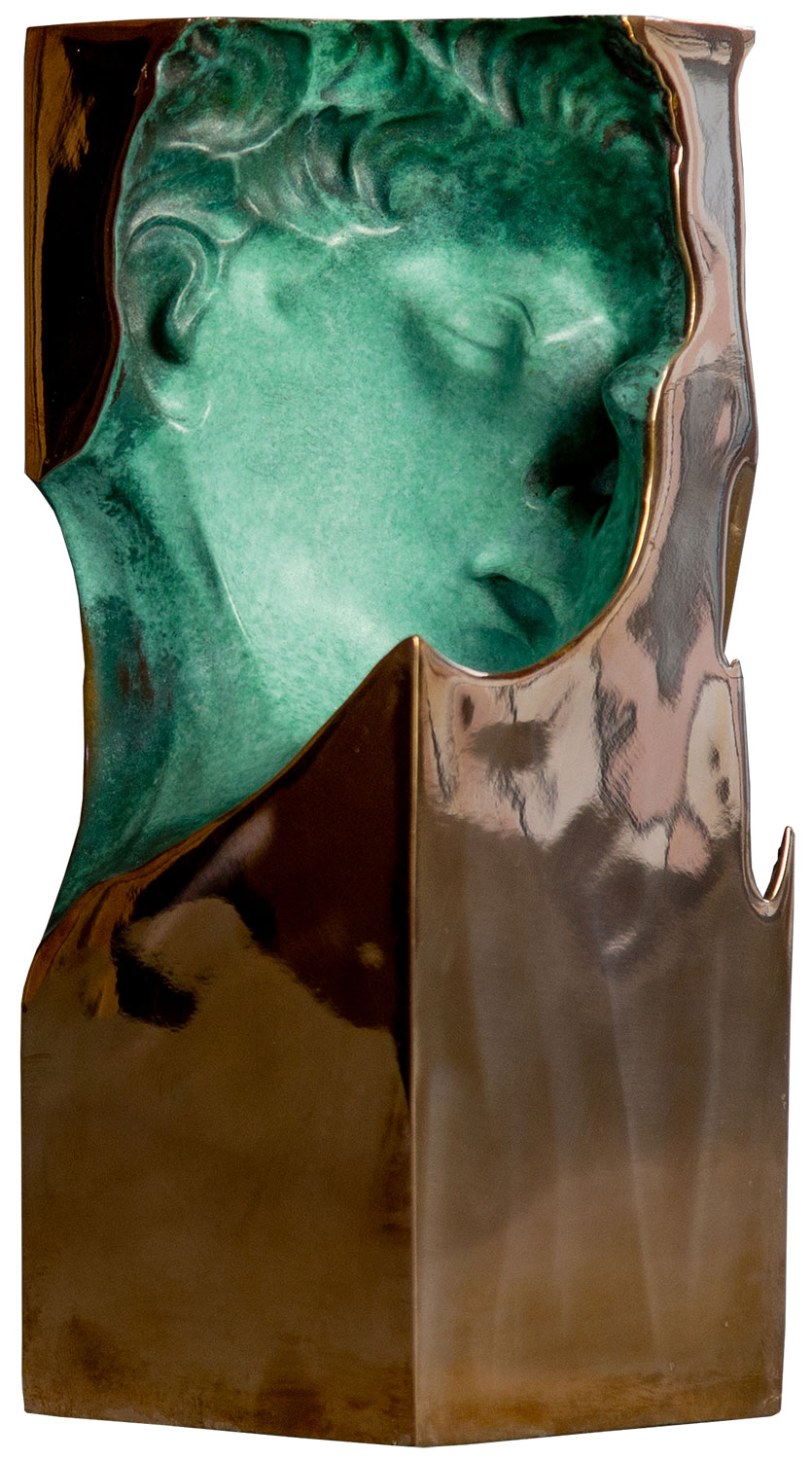 Bronze, grün patiniert und hochglanzpolierte Oberfläche, gestempelt. Limitierte Auflage 5 Exemplare. Aus der Serie 'Loves who don't know how to get by in this world'. Mit Zertifikat. Format 37 x 15 x 15 cm (H/B/T).