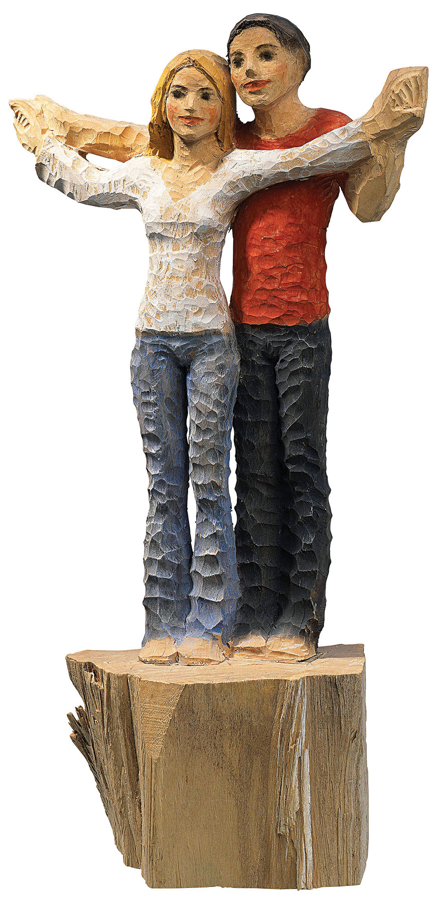 Michael Pickl schafft Skulpturen von ganz und gar zeitgenössischen Männern und Frauen, wie sie uns täglich auf der Straße begegnen könnten und porträtiert sie in Momenten von Entspannung und Glück. Kein Holz ist dem Künstler zu krumm, um nicht doch einen Menschen, einen ganz modernen sogar, daraus zu schaffen. 'Wir gehören zusammen', drückt diese Doppelfigur deutlich aus. Das hat in diesem Falle noch eine tiefere, handwerkliche Bedeutung: Pickl hat seine Skulptur aus einem einzigen Holzblock geschlagen. Polymerer Kunstguss in Holzfinish, zum Teil von Hand bemalt. Limitierte Auflage 199 Exemplare, signiert und nummeriert. Format 28 x 51 x 13 cm (B/H/T), Gewicht ca. 4,5 kg.