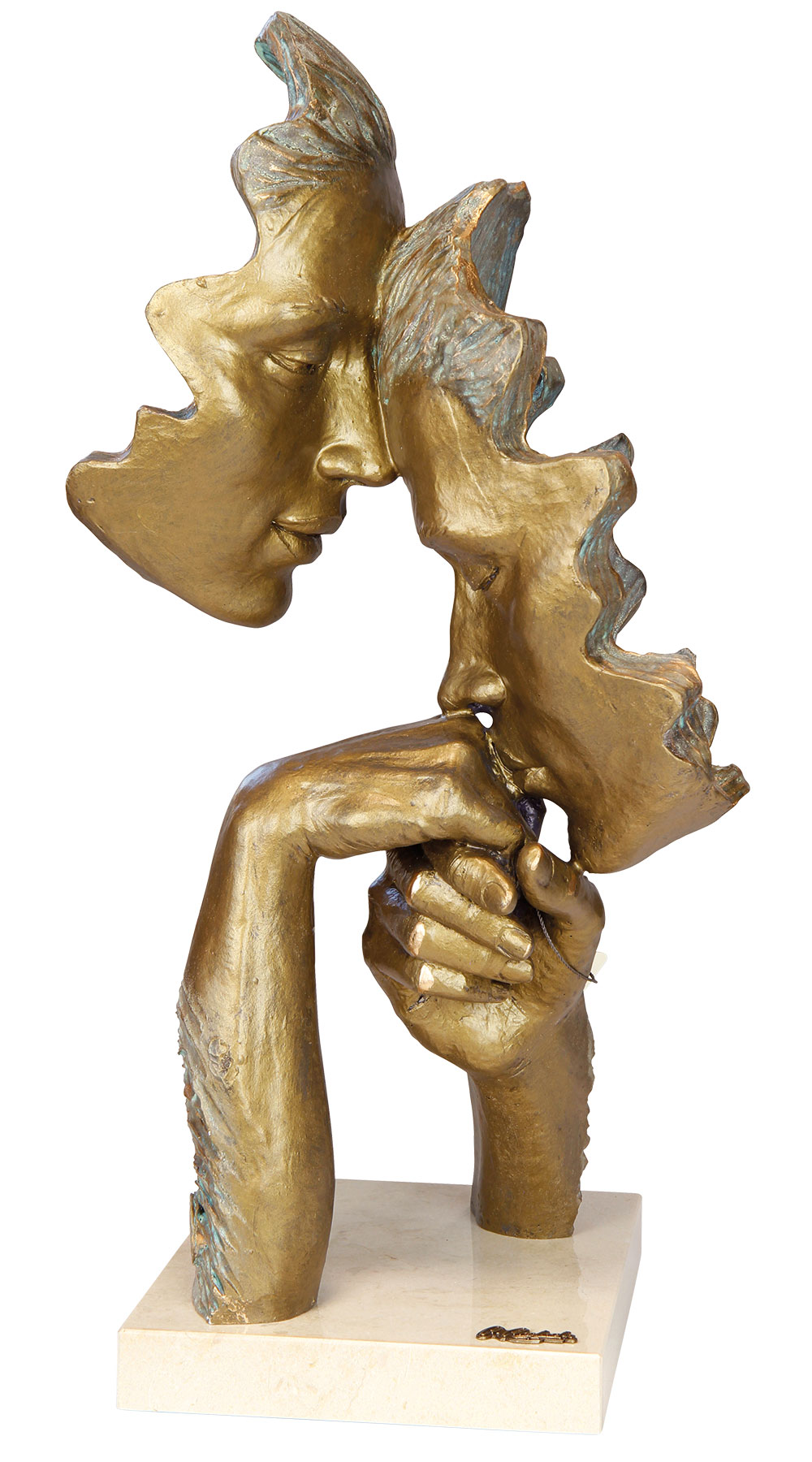 De sculptuur 'Familiarity' is een ongewone woonaccessoire. Kunststeen, groen en bronskleurig patina. Er is een klein goudkleurig plaatje aan de basis met de handtekening van de kunstenaar erop gegraveerd. Afmetingen 50 x 22,5 x 21 cm (h/w/d). Gewicht 1,45 kg.