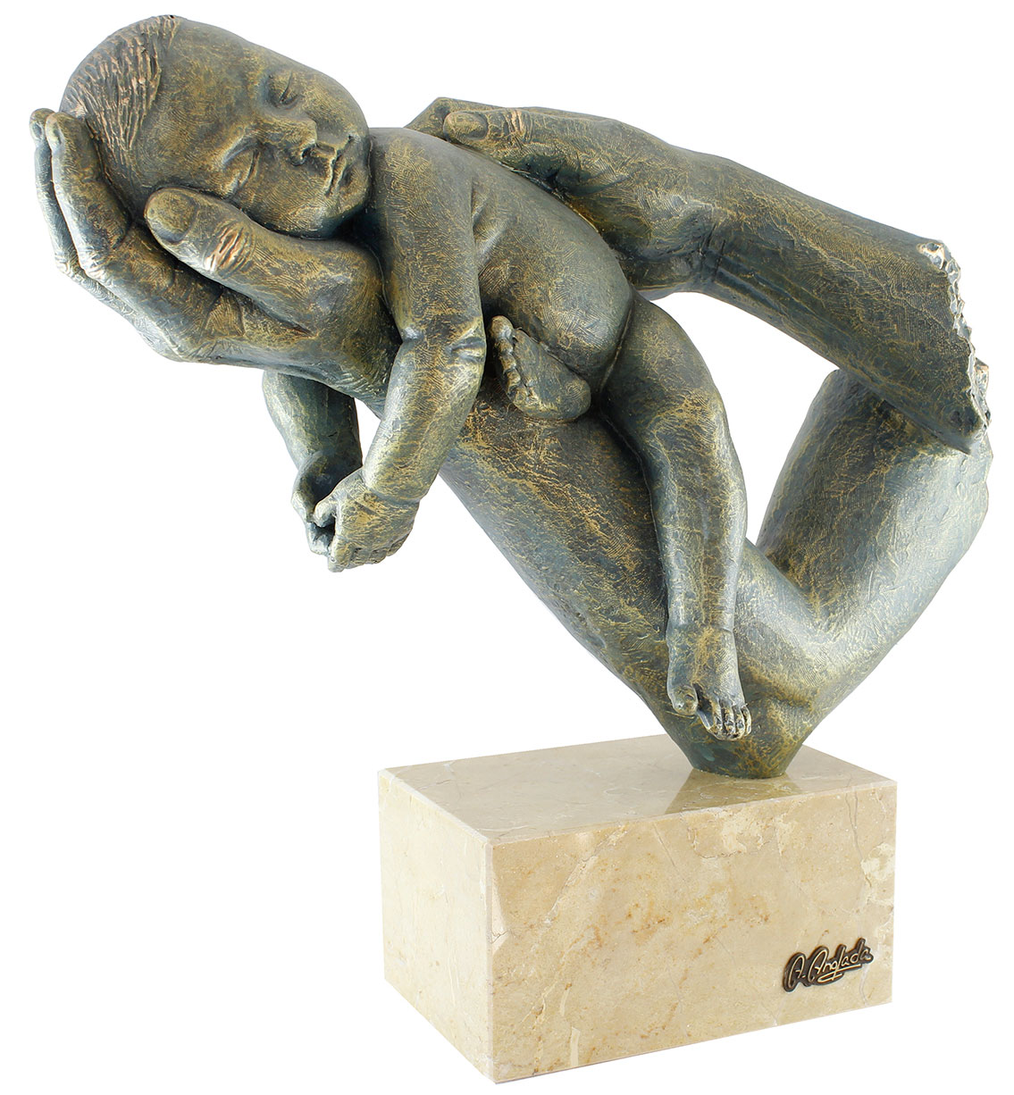 Een moment van diepe intimiteit tussen kind en ouder. Sculptuur gemaakt van gegoten kunst met een steenlook, groen patina. Er is een kleine goudkleurige plaquette op de marmeren voet met de handtekening van de kunstenaar erop gegraveerd. Afmetingen 33 x 14 x 32 cm (h/w/d). Gewicht ca. 6,8 kg.