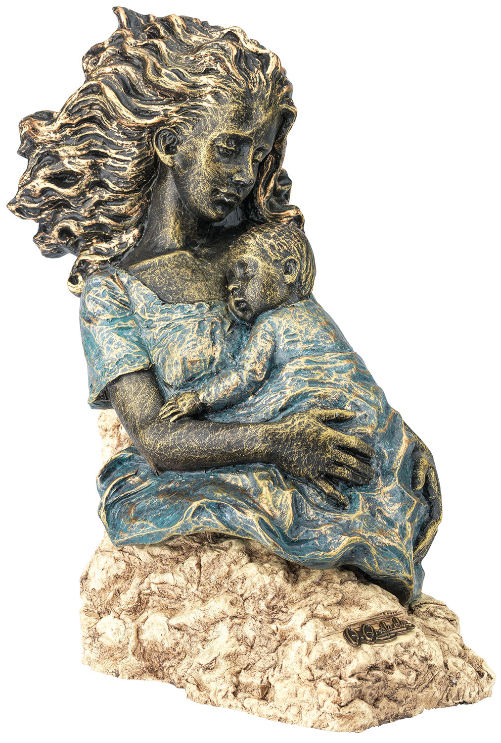 Alles is goed hier! De Spaanse kunstenaar heeft op gevoelige wijze de nabijheid van moeder en kind vastgelegd met ontroerende, naturalistische details. Gegoten steen, groen en brons gepatineerd. Kleine goudkleurige plaquette in de voet met gegraveerde handtekening. Afmetingen 27 x 12 x 20 cm (h/w/d).