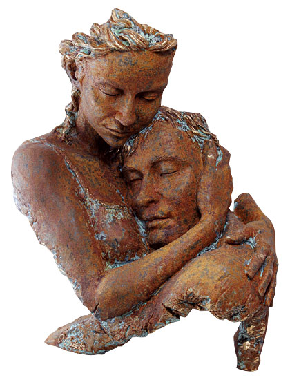 De band tussen man en vrouw. De sculptuur 'Overeenkomst' van Angeles Anglada is een ongewone woonaccessoire met veel potentieel voor filosofische overpeinzingen. Gegoten steen, groen en brons gepatineerd. Afmetingen 35,5 x 29 x 18 cm (h/w/d).