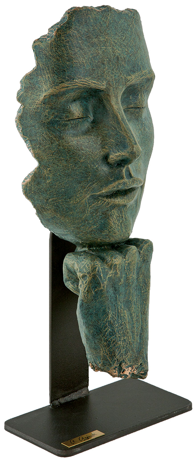 De houding van een denker - Angeles Anglada's sculptuur 'Pause' is een ongewone woonaccessoire met veel potentieel voor filosofische overpeinzingen. Gegoten steen, groen en brons gepatineerd. Aan de basis zit een klein goudkleurig plaatje met de handtekening van de kunstenaar erop gegraveerd. Afmeting 33 x 14 x 8 cm (h/w/d).