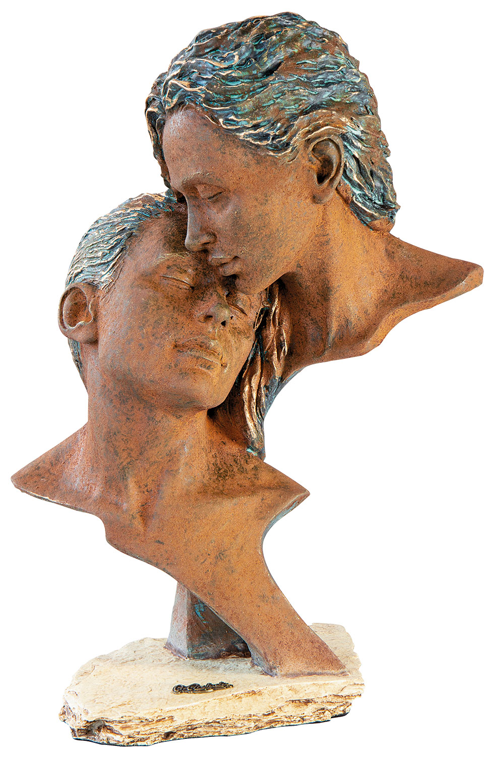 Tederheid en intieme nabijheid, gevat in een puntige en indrukwekkende manier. Gemaakt van gegoten steen, bronskleurig en groen gepatineerd met gesigneerde voet. Afmeting 40 x 19,5 x 18 cm (h/w/d). Gewicht ca. 4,2 kg.