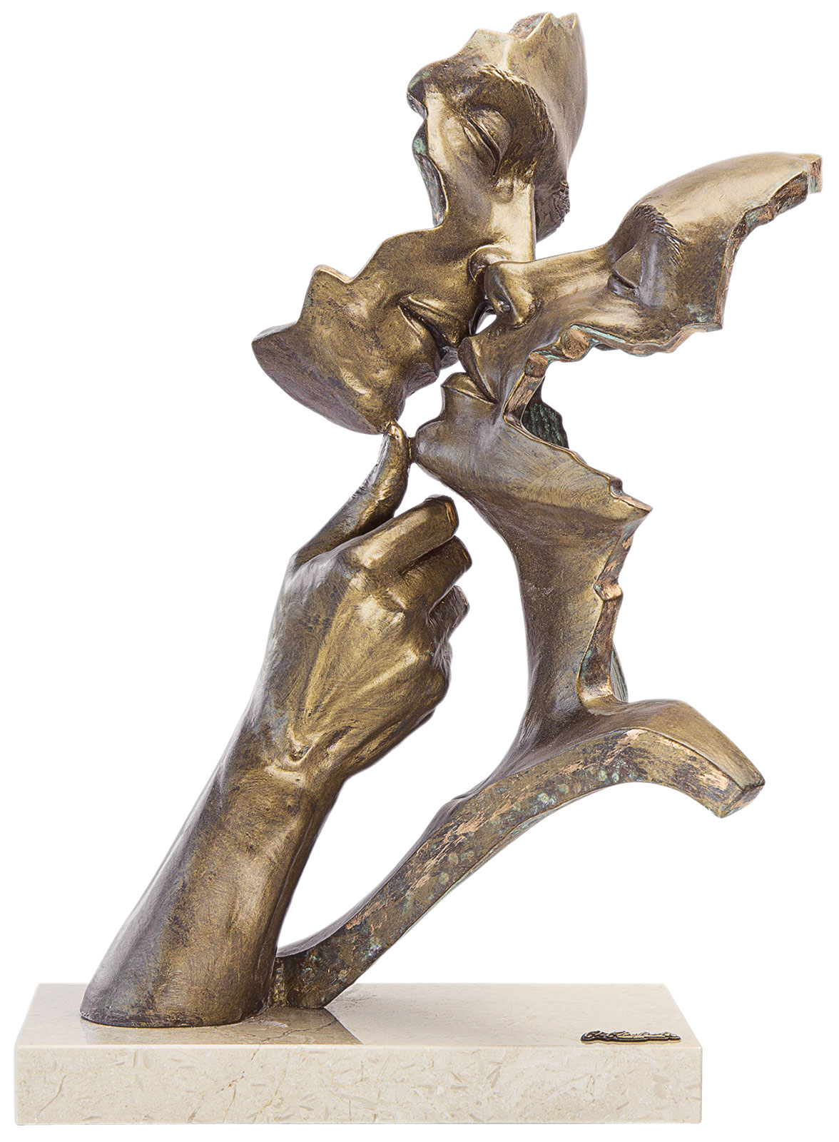 Sensuele allegorie van partnerschap. De originele beelden van de Spaanse beeldhouwer Maria Angeles Anglada inspireren door hun fragmentarische weergave, die ruimte laat voor identificatie en interpretatie. Gemaakt van gegoten steen, gepatineerd in bronskleur met gesigneerde voet. Formaat 40 x 24 x 12 cm (h/w/d).