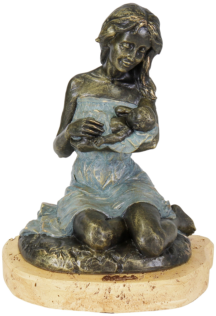 De Spaanse kunstenaar heeft op gevoelige wijze de nabijheid van moeder en kind vastgelegd met ontroerende, naturalistische details. Gegoten steen, groen en brons gepatineerd. Kleine goudkleurige plaquette op de voet met gegraveerde handtekening. Afmetingen 42,5 x 11 x 31 cm (h/w/d).