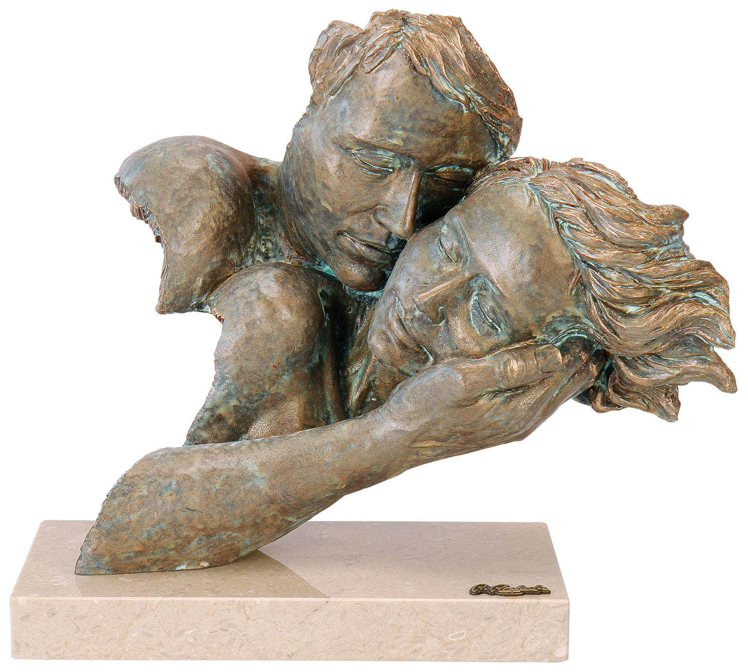Sensuele allegorie van partnerschap. De originele beelden van de Spaanse beeldhouwer Maria Angeles Anglada inspireren door hun fragmentarische weergave, die ruimte laat voor identificatie en interpretatie. Gemaakt van gegoten steen, gepatineerd in bronskleur met gesigneerde voet. Afmetingen 27 x 31,5 x 12 cm (h/w/d).