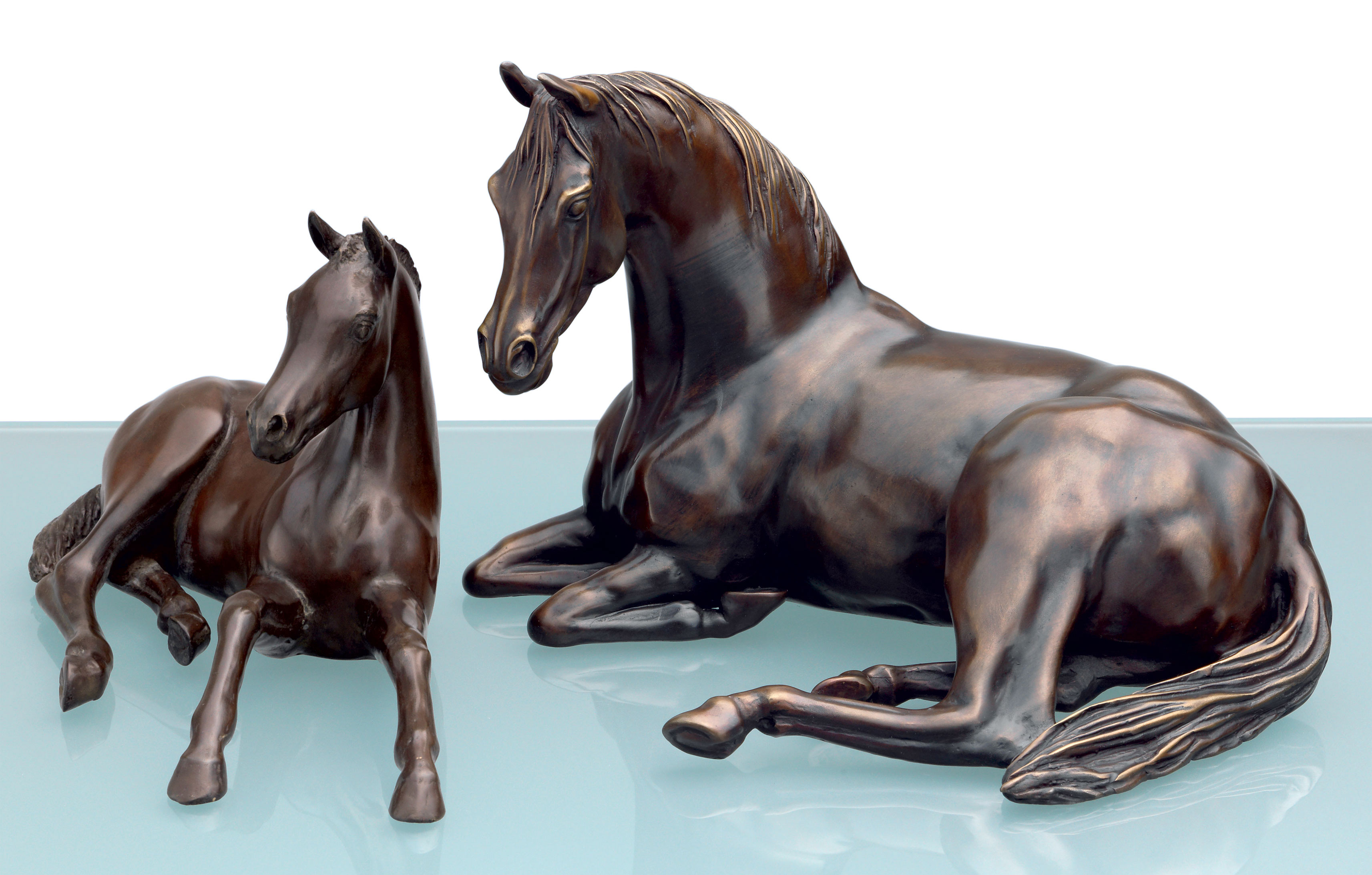 Annette Diekemper is zelf al 25 jaar actief als ruiter en een groot liefhebber van klassieke rijkunst. Met veel inlevingsvermogen vangt ze de volledige veelzijdigheid van deze fascinerende dieren qua ras, temperament en uitstraling en weet ze deze op een levendige en oprechte manier over te brengen op de kijker. De Arabische merrie met haar veulen is een symbool van harmonie en veiligheid. De anders zo verlegen en oplettende dieren zijn gevangen in een moment van vertrouwde intimiteit. De beeldhouwer heeft het spierenspel van deze majestueuze wezens tot in het kleinste detail weergegeven - een meesterwerk van moderne dierenkunst. 2 sculpturen als een exclusieve ars mundi editie in fijn brons, met de hand gegoten met behulp van de verloren was techniek, gepatineerd en gepolijst met de hand. Beperkte oplage van 199 exemplaren elk, genummerd en gesigneerd. Veulen: Afmeting 22 x 12 x 10 cm, gewicht 1,3 kg. Merrie: Afmeting 22 x 15 x 17,5 cm, gewicht 3 kg. Beide sculpturen in een set.