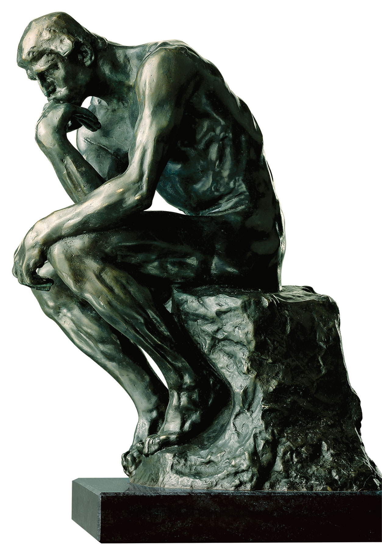 Rodin zag zichzelf als een creatieve reus en zijn denkwijze onthult ook een karaktertrek van de grootste beeldhouwer van zijn tijd. Zijn lange preoccupatie met Dante had hem existentiële angst bezorgd; hij ontwikkelde ideeën over een hemel en een hel waarvan de grenzen onbepaald waren. In 1880 kreeg hij een overheidsopdracht voor een monumentaal portaal voor het Musée des Arts décoratifs - zijn 'Poorten van de Hel', ontwikkeld op basis van Dante's 'Inferno', waarvan de 186 dramatische en dynamische figuren hem tot het einde bezig hielden. Sommige figuren die hij voor de poort ontwierp, liet hij vrij. Hiertoe behoort de 'Denker', krachtig gemodelleerd met opzwellende spieren en onbeweeglijke, gesloten ledematen, die onder intense spanning het tragische lot van de mensheid overdenkt. De vorm die is ontwikkeld voor het spel van licht en schaduw is vereenvoudigd, de figuur is uit de tijd getild naar een universele staat. Door deze expressieve heftigheid werd Rodin de grootste inspirator van het modernisme en een van de 40 authentieke bronzen exemplaren van 70 cm hoog van de 'Denker' bracht laatst een verkoopprijs van 10,7 miljoen dollar op een veiling bij Christie's in Parijs in 2022.Origineel: Musée Rodin, Parijs. Gemaakt in 1880, gesigneerd in de mal. Museumreplica. Uitvoering in fijn brons, gegoten met behulp van de verloren vorm techniek. Fijn gepatineerd en gepolijst. Hoogte 38 cm, op een basis van diabaas. Afmetingen van de sokkel 20 x 3 x 13 cm (B/H/D).