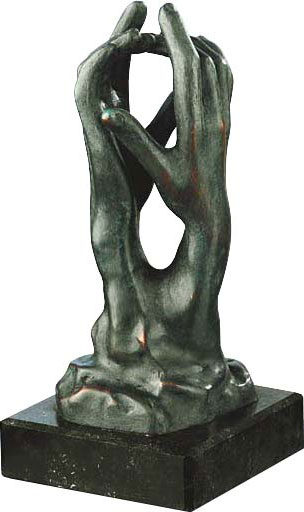 De naam van de gotische kathedraal, die naar de hemel reikt, is afgeleid van het Griekse kathedra, wat 'zetel van God' betekent. Voor Rodin belichaamden de handen de creatieve, goddelijke kracht van de schepping. Zonder elkaar aan te raken omarmen ze de ruimte waarin het idee, de goddelijke vonk, wordt gecreëerd, als een dans van handen. Met zijn studie verhief Rodin het fragment tot een complete sculptuur, waarmee hij vooruitliep op grote delen van de moderne beeldhouwkunst. Origineel: Brons, 65 cm hoog, Musée Rodin, Parijs. Gemaakt in 1908. reductie. Polymeer ars mundi museum replica, met de hand gegoten, met gebronsd oppervlak. Hoogte 15 cm.
