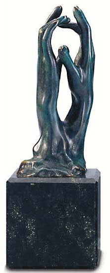 Waarom zijn onze gotische kathedralen zo mooi? Omdat men hier, in alle voorstellingen van het leven, een kenmerk van hemelse liefde ontdekt. Rodin geloofde dat de spitsboog, het belangrijkste element van de gotische kathedraalarchitectuur, voortkwam uit het gebaar van de handen die in gebed werden opgeheven. Origineel: Brons, Musée Rodin, Parijs. Gemaakt in 1908. ars mundi polymeer museum replica met de hand gegoten met gebronsd oppervlak. Hoogte inclusief voetstuk 18,5 cm. Gewicht ca. 2 kg.