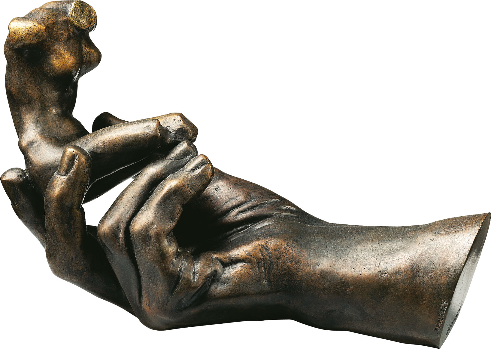 De vrouwelijke torso in Rodins hand symboliseert levendig wat hem zijn leven lang dreef: de ontembare wil om klei zijn uiteindelijke vorm en leven te geven. Rodin boetseerde zelf nog de vrouwelijke torso, Amédé Bertault nam het afgietsel van de hand op Rodins sterfbed: Brons, Musée Rodin, Parijs / Metropolitan Museum of Art, New York. Gemaakt in 1917. ars mundi museum replica met de hand gegoten in polymeer kunstgietwerk met gebronsd oppervlak. Afmetingen 24 x 15 x 12 cm. Gesigneerd in het gietsel. Gewicht ca. 1,5 kg.