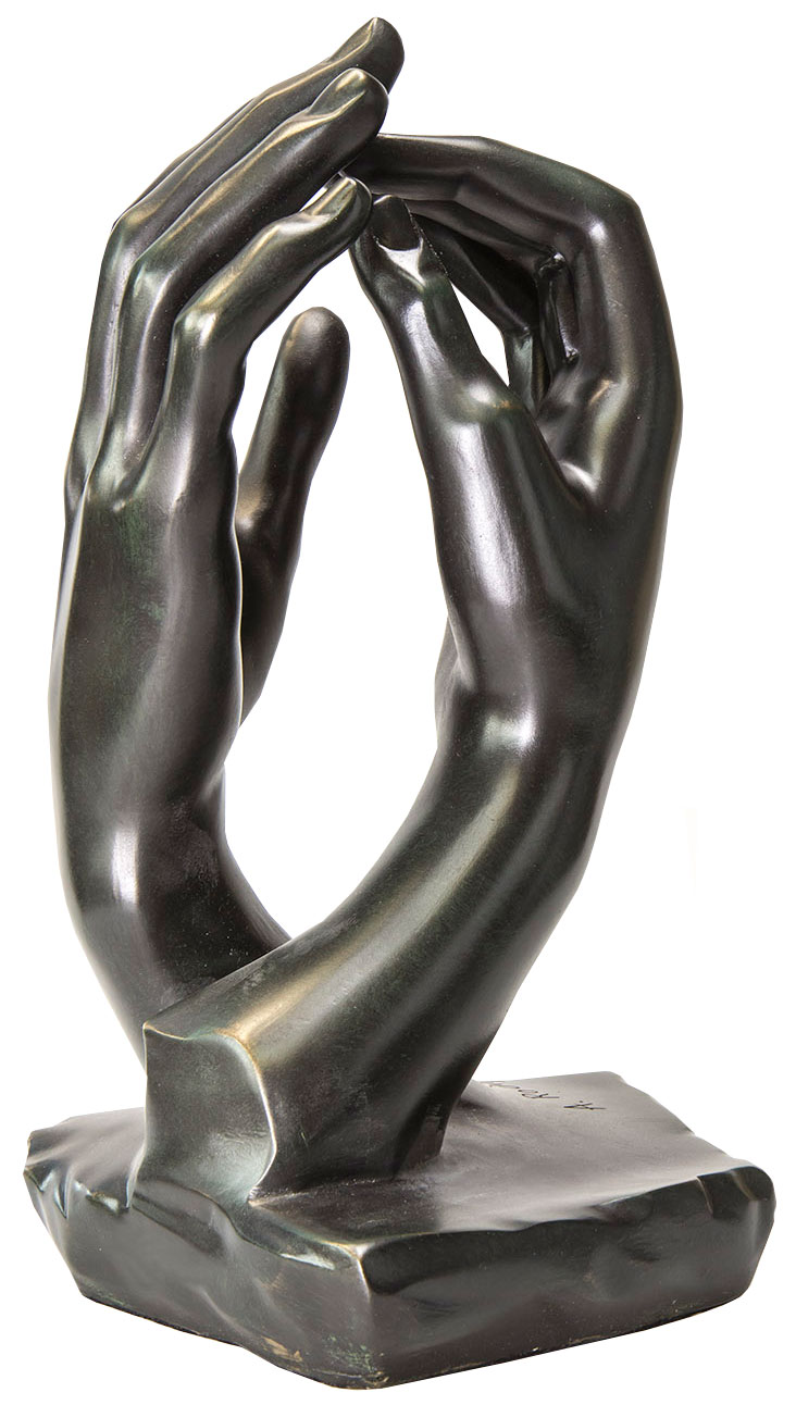 De naam van de gotische kathedraal, die naar de hemel reikt, is afgeleid van het Griekse kathedra, wat 'zetel van God' betekent. Voor de beeldhouwer Rodin belichaamden de handen de creatieve, goddelijke kracht van de schepping. Zonder elkaar aan te raken omarmen ze de ruimte waarin het idee, de goddelijke vonk, wordt gecreëerd, als een dans van handen. Met zijn studie verheft Rodin het fragment tot een complete sculptuur en loopt daarmee vooruit op grote delen van de moderne beeldhouwkunst. Origineel: Brons, 65 cm hoog, Musée Rodin, Parijs. Bewerking. Polymeer ars mundi museum replica met de hand gegoten, met gebronsd oppervlak. Hoogte 36,5 cm. Gewicht ca. 11 kg.