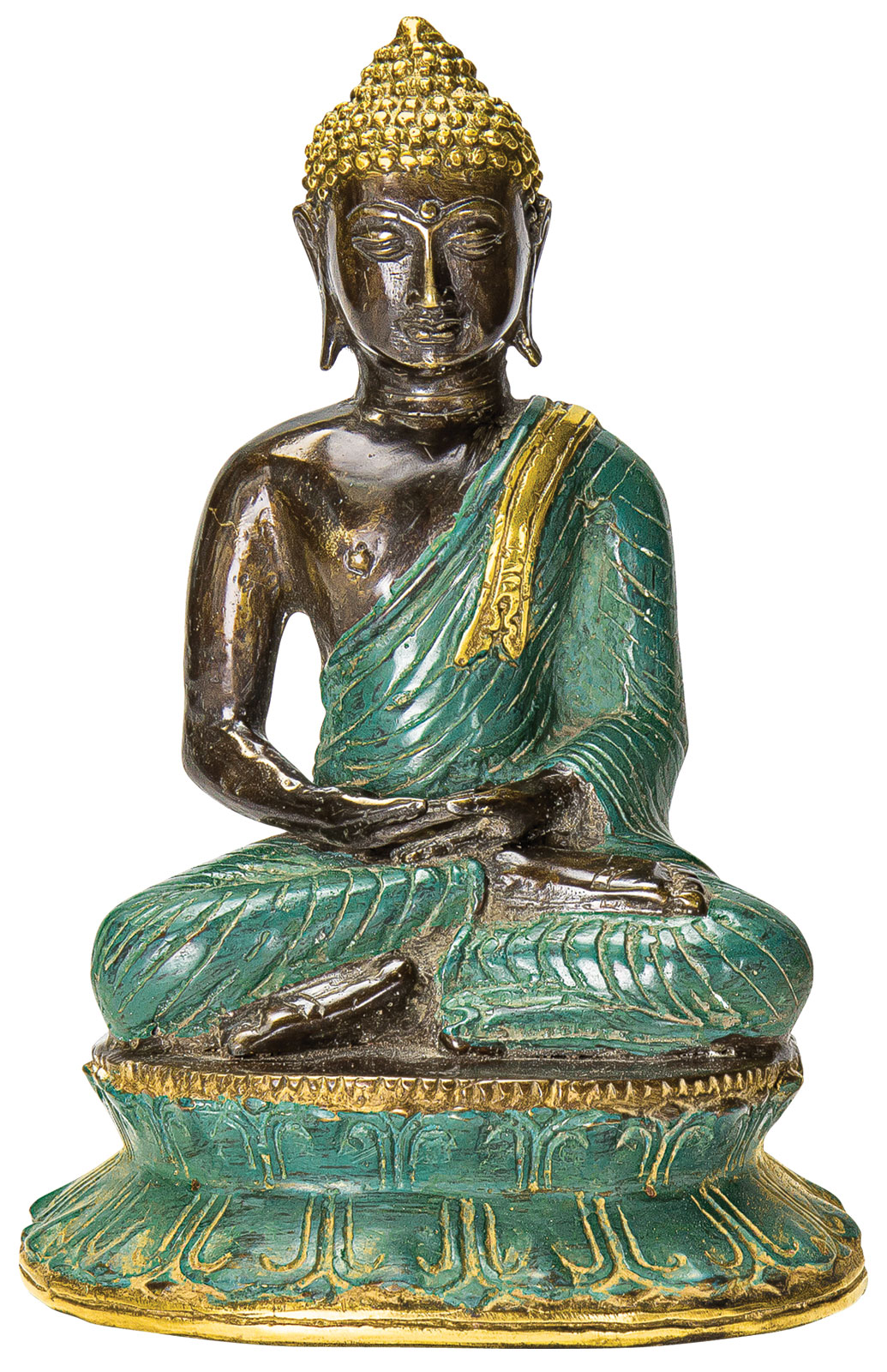 Kracht ligt in rust. Deze Boeddha zit op een sokkel van lotusbloesems, verzonken in zichzelf. Gegoten uit massief brons, elegant afgewerkt in goudbruin en antiekgroen. Afmetingen 24,5 x 16 x 14,5 cm (h/w/d). Gewicht 2,5 kg.