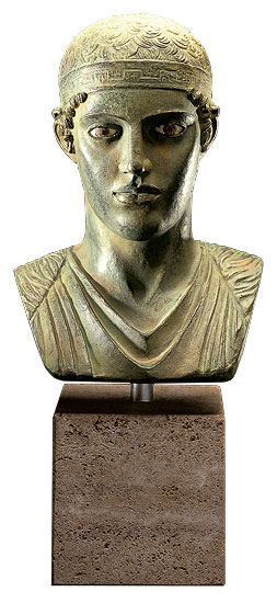Productinformatie "Buste van de wagenmenner van Delphi, brons op marmeren sokkel, sculptuur"