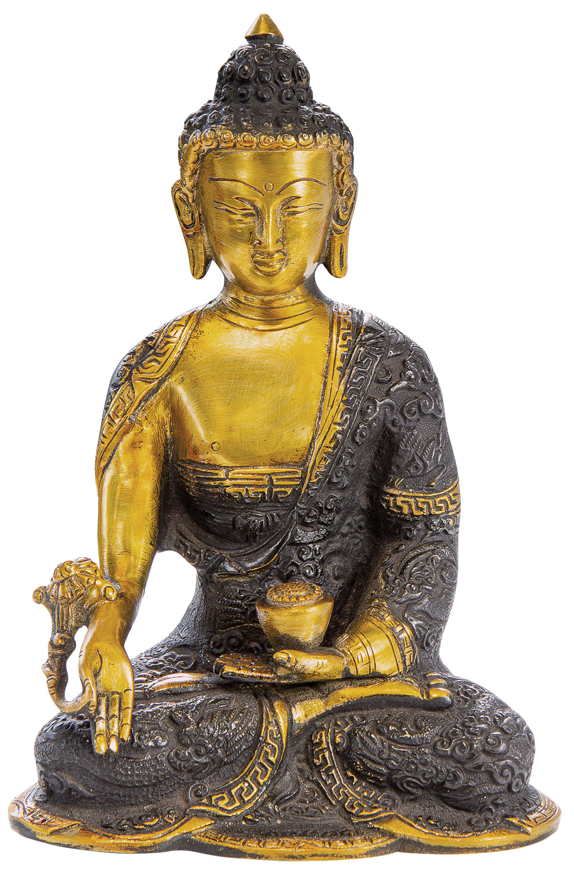 De Boeddha van de genezing in zijn klassieke afbeelding met een kom met genezende nectar in zijn linkerhand en een myrobalan tak in zijn rechter. Messing met gouden en zwarte afwerking. Afmetingen 22 x 15 x 9,5 cm (h/w/d). Gewicht 2,3 kg.