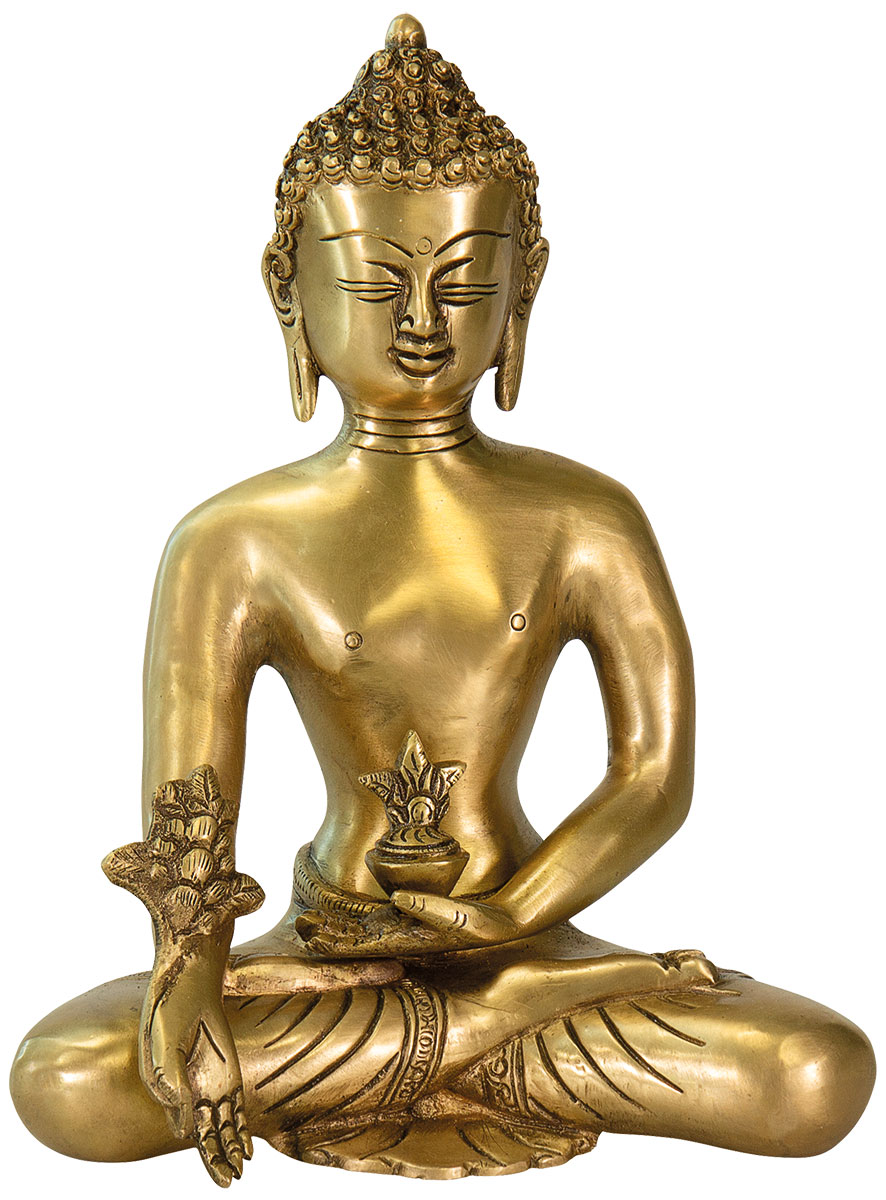 De genezende Boeddha is afgebeeld zittend op een lotusblad met gesloten ogen. In zijn linkerhand houdt hij een kom met genezende nectar. Zijn rechterhand houdt een myrobalan tak vast, waarvan de vrucht het innerlijke vergif van hebzucht, haat en waan kan neutraliseren. De gedetailleerde figuur van glanzend messing straalt rust en vertrouwen uit. Afmetingen 22,5 x 17 x 15 cm (h/w/d). Gewicht ca. 2,5 kg.