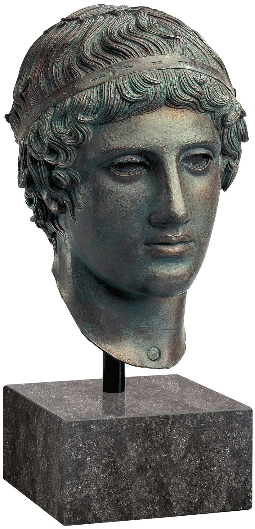 Dit epifaniehoofd met zijn gelijkmatige gelaatstrekken en de in de nek geknoopte bandage van de overwinnaar, misschien ooit versierd met zilveren inlegwerk, is een bijna klassiek voorbeeld van de aanpassing van Rome aan buitenlandse geavanceerde beschavingen. Origineel: Staatliche Antikensammlungen und Glyptothek, München. Romeins, rond de geboorte van Christus naar een model uit de 4e eeuw v.Chr. Polymeer ars mundi museumreplica, met de hand gegoten met gebronsd oppervlak. Hoogte met voet 33 cm.