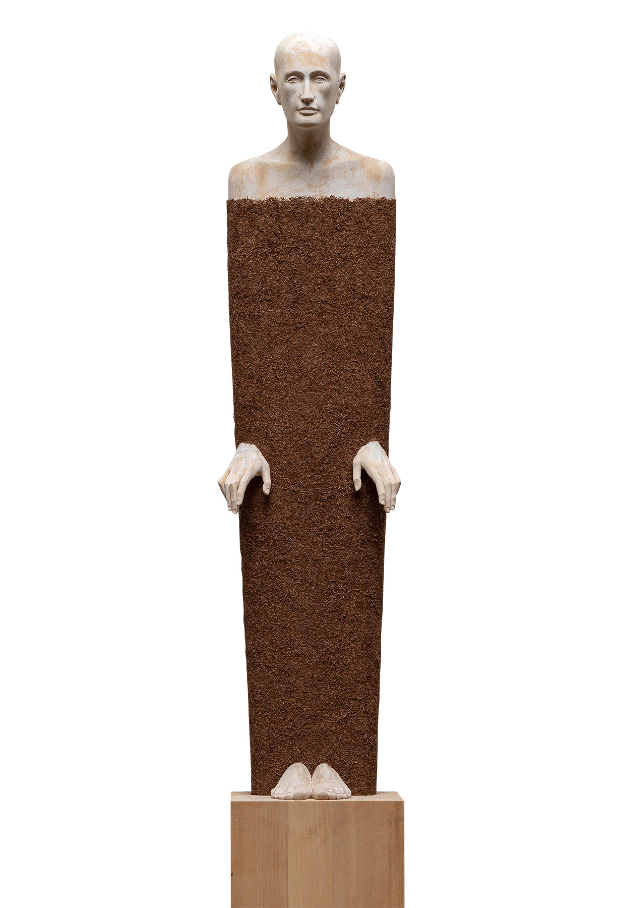 De figuur van Perathoner lijkt te zijn gewikkeld in een beschermende deken van lariksnaalden, dicht bij de grond. Sculptuur gemaakt van lindehout gedeeltelijk bedekt met lariksnaalden. Inclusief lindehouten sokkel. Hoogte figuur 123 cm. Hoogte sokkel 60 cm. Totale hoogte 183 cm. Gewicht 21 kg.