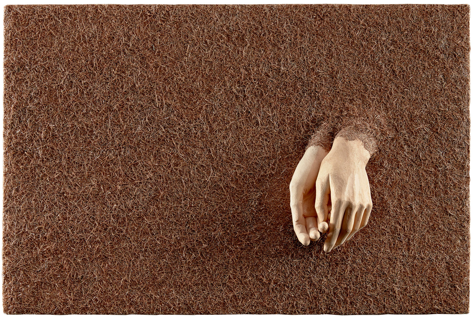 Aanrakende handen, die uit het niets lijken te verschijnen in Perathoners wandreliëf, zijn een uitdrukking van liefdevolle zorg en een innerlijk verlangen naar geborgenheid. Sculptuur gemaakt van Zwitsers grenenhout bedekt met lariks naalden. Gesigneerd. Afmeting 55 x 83 cm (H/W). Gewicht 3 kg.