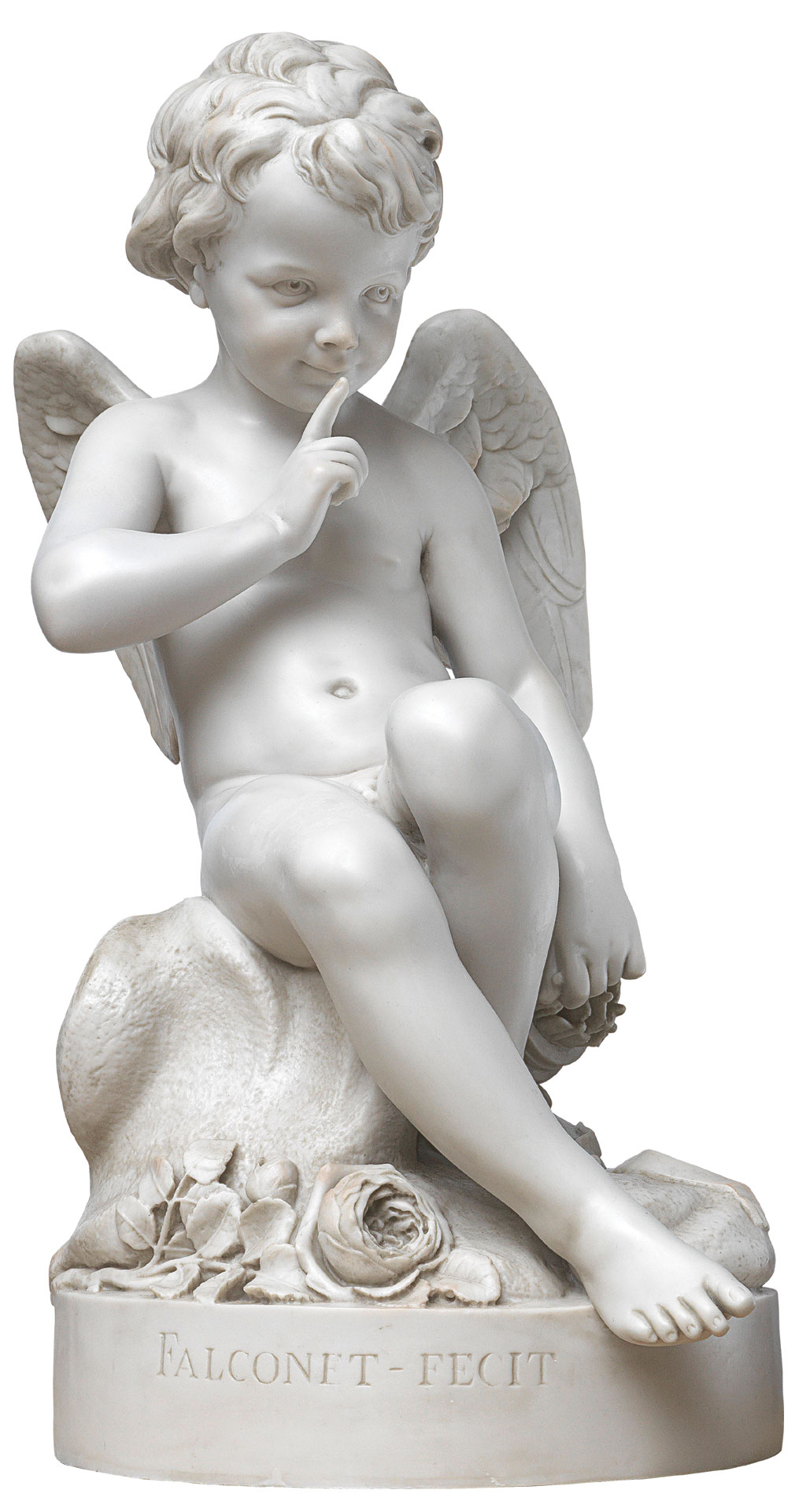 Een liefdesstuk in de kunstgeschiedenis: Falconets Amor.L'Amour menaçant, de 'dreigende Cupido' uit 1757, betekende niet alleen Falconets artistieke doorbraak, maar ook zijn professionele. De vinger van Cupido die naar de gesloten lippen wijst, belooft geheimhouding. En toch, terwijl hij ondeugend naar zichzelf lacht, lijkt hij zich bewust te zijn van zijn macht over elk menselijk lot. Origineel: Musée du Louvre, Parijs. Marmer. Ars mundi museum replica, gegoten steen, met de hand gegoten. Afmetingen 50 x 92 x 65 cm (B/H/D). Gewicht ca. 110 kg.