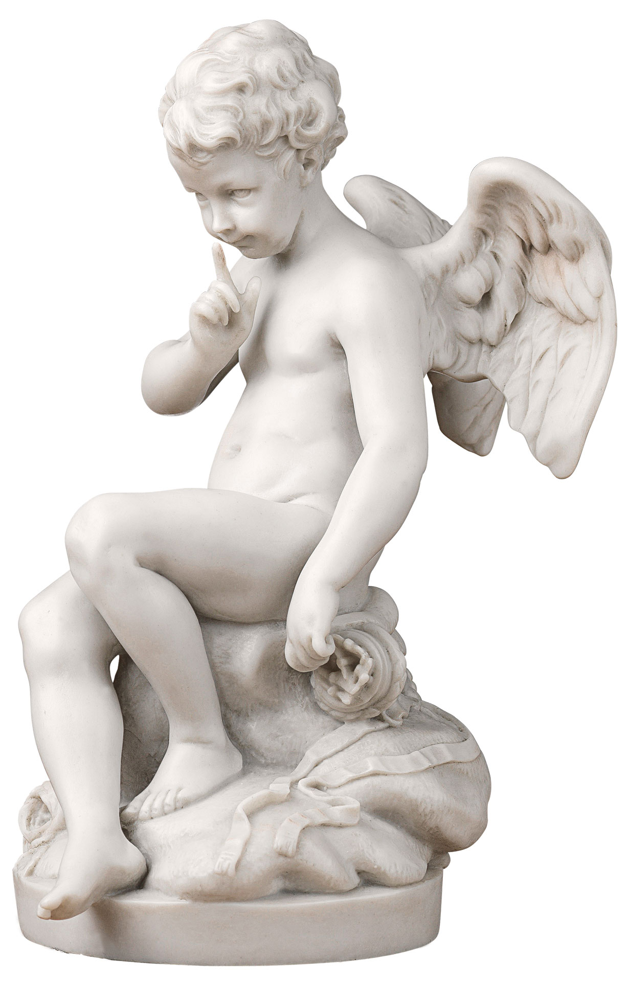 Een werk van liefde in de kunstgeschiedenis: Falconets Cupido Falconet presenteerde al in 1755 een gipsmodel van zijn Cupido en werd met enthousiasme ontvangen door de critici van zijn tijd. Twee jaar later werd hij gepresenteerd als een marmeren beeld samen met zijn al even beroemde werk 'La Beigneuse'. De vinger van Cupido die naar de gesloten lippen wijst, belooft geheimhouding. En toch, terwijl hij schalks in zichzelf glimlacht, lijkt hij zich bewust te zijn van zijn macht over elk menselijk lot. Origineel: Musée du Louvre, Parijs. Marmer. Ars mundi museum replica, gegoten steen, met de hand gegoten. Afmeting 12 x 24 x 13,5 cm (b/h/d), gewicht 2,5 kg.