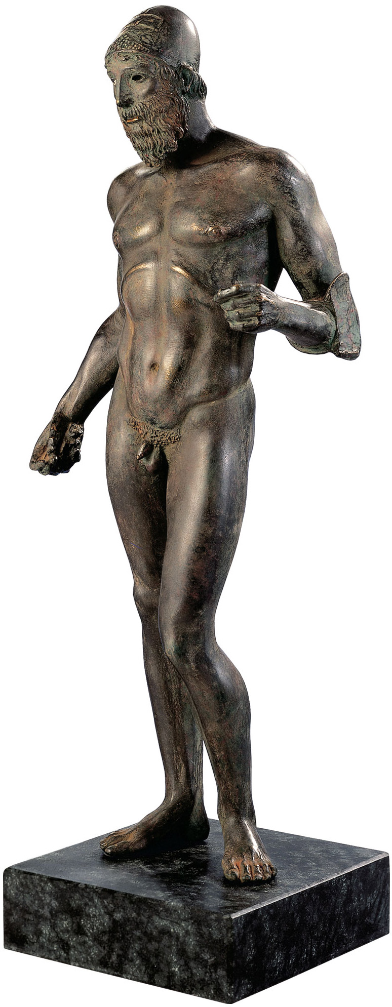 Het gebeurde op 16 augustus 1972 aan de kust van Calabrië, niet ver van de zeestraat tussen het Italiaanse vasteland en Sicilië: de Italiaanse duiker Stefano Mariottini stuitte bij toeval op een arm, een knie en tenen die donkergroen uit het zand staken op een diepte van 8 meter. Een paar dagen later brachten kikvorsmannen uit Messina de twee volledig intacte bronzen beelden, die bijna 2 meter hoog waren, terug met behulp van een met lucht gevulde ballon. De beelden van de twee ongeklede Griekse helden waren waarschijnlijk op reis naar Rome, waar Griekse kunst erg populair was in de Romeinse tijd, toen hun schip schipbreuk leed in de buurt van Riace. Ze droegen ooit schilden, speren of zwaarden. De geniale beeldhouwer Phidias wordt beschouwd als hun schepper. Toen de bronzen beelden na 7 lange jaren werden bevrijd van hun kalkaanslag, wekten ze de bewondering van 1 miljoen mensen in Florence. Op hun tweede tentoonstellingslocatie, het Quirinaal Paleis in Rome, werd het recordaantal bezoekers overtroffen. De schoonheid en artistieke expressie van de helden van Riace zijn uniek. Het zijn bronzen beelden van het Griekse ideaal van harmonie tussen lichaam en geest. Origineel van rond 452 voor Christus, in het Museo Reggio di Calabria. Reductie. Polymeer ars mundi museum replica, met de hand gegoten. Met fijn bronspatina. Op een diabaas sokkel, afmetingen 15 x 15 x 5 cm, hoogte met sokkel ca. 51 cm.