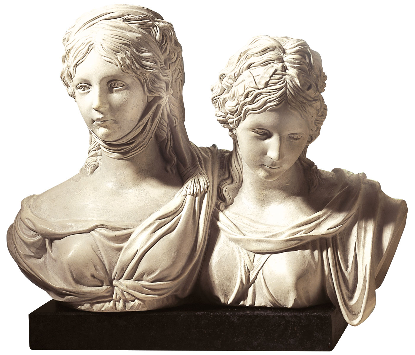 In 1793 vond een ongewoon dubbel huwelijk plaats. De 18-jarige prinses Luise van Mecklenburg-Strelitz trouwde met de kroonprins van Pruisen, Frederik Willem III, en de 16-jarige Friederike trouwde met zijn jongere broer Louis. De aanleiding voor Johann Gottfried Schadow om dit sierlijke beeld van de twee zussen te maken. Origineel: Staatliche Museen zu Berlin - Preußischer Kulturbesitz, Nationalgalerie, 1797, marmer. Polymeer ars mundi museum replica, met de hand gegoten. Totale hoogte 19,5 cm, breedte 23 cm, sokkelafmetingen ca. 17 x 2 x 11 cm (B/H/D).