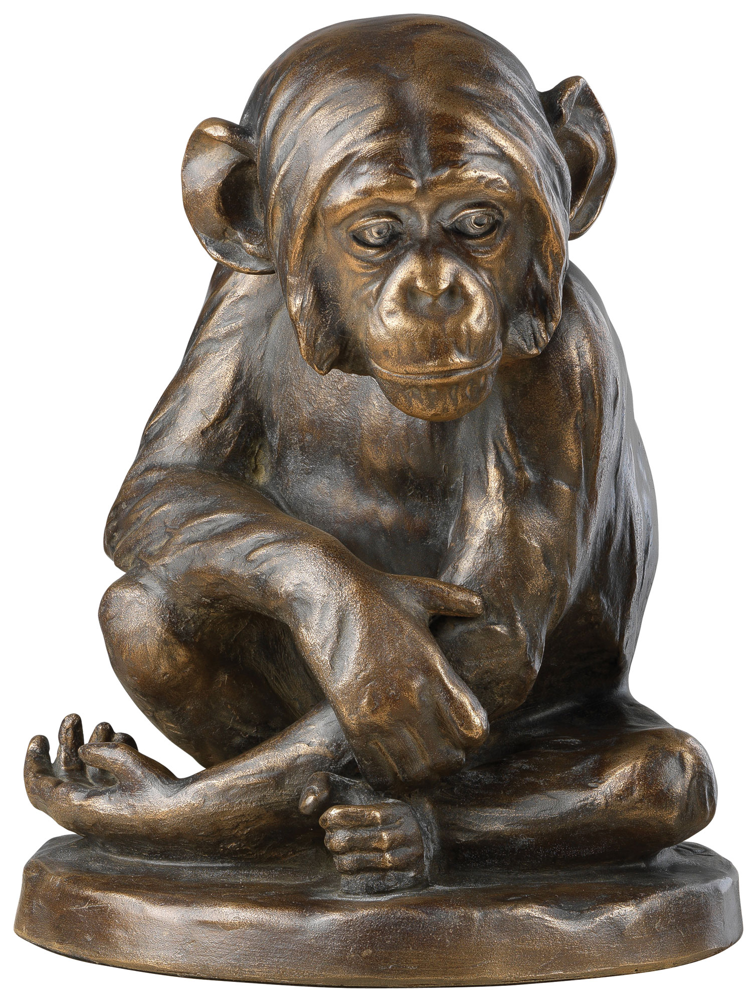 Een natuurspektakel van wereldklasse: de 'Chimpansee' van Johann Robert Korn. Korn combineert een nauwkeurige zoölogische blik met een subtiele toespeling op een van de belangrijkste wetenschappelijke thema's van zijn tijd - het Darwinisme - en geeft de chimpansee een bijna menselijke, bedachtzame uitdrukking. Zelfs hier, net als in zijn vele latere werken, laat de kunstenaar zien dat zijn afbeeldingen van dieren worden gekenmerkt door een diep respect voor het schepsel. Uitgave in gegoten steen met gebronsd oppervlak. Gelimiteerde oplage van 499 exemplaren, genummerd en gesigneerd. Met certificaat. Afmetingen 28 x 34 x 24,5 cm (B/H/D), gewicht 14 kg. Exclusief bij ars mundi.
