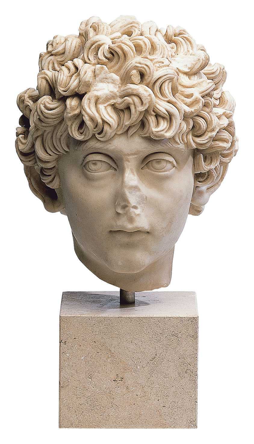 Een hofbeeldhouwer in de Hadriaanse traditie worstelde dit opvallend knappe portret van een jonge man uit het marmer. Met zijn weelderige krullen en zachte, wipte lippen toont het ons de zeer individuele persoonlijkheid van de jonge Marcus Aurelius. Origineel: De Norbert Schimmel Collectie, New York. Hadrianus, marmer. Ca. 140-170 n.Chr. Polymeer ars mundi museum replica met de hand gegoten, hoogte met voet 44 cm.