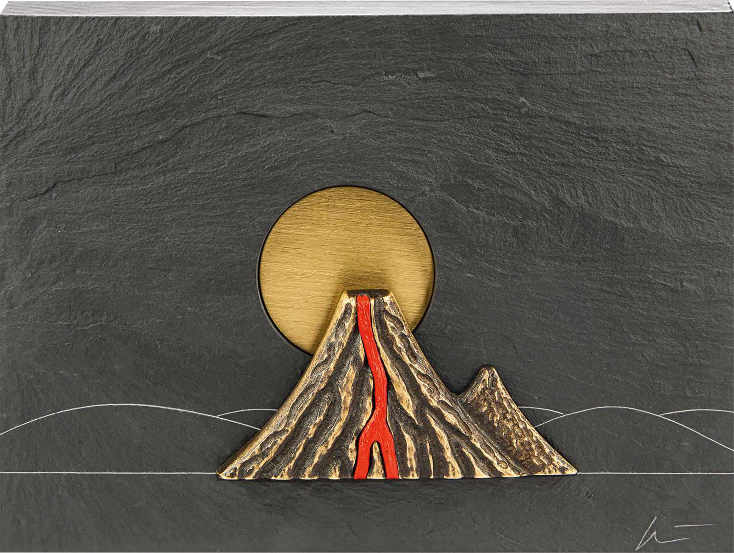Wandobject van leisteen met brons en messing, deels gekleurd. WVZ nr. 490, elk object is uniek, gesigneerd door de kunstenaar. Afmeting 15 x 20 cm (H/W). Met ophangsysteem.