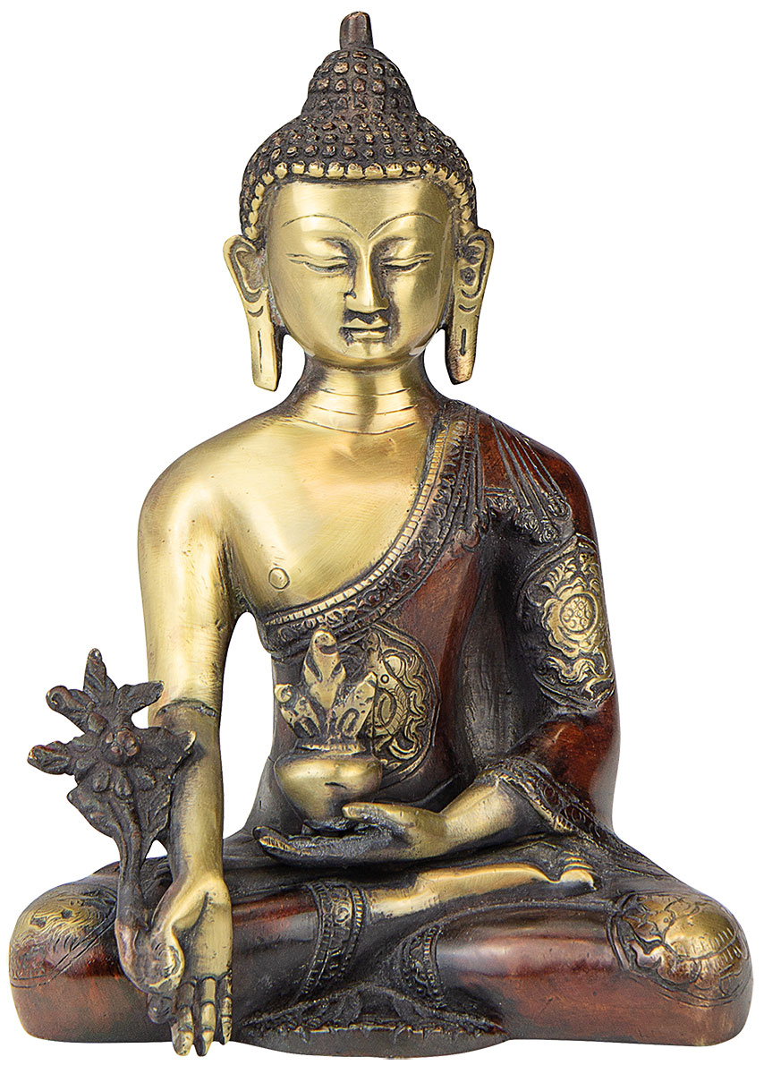 Als genezer wordt Boeddha hier afgebeeld met nectar en een myrobalan tak. Messing figuur met een gouden, roodachtige en zwarte afwerking. Afmetingen 19 x 14,5 x 10,5 cm (h/w/d). Gewicht 1,7 kg.