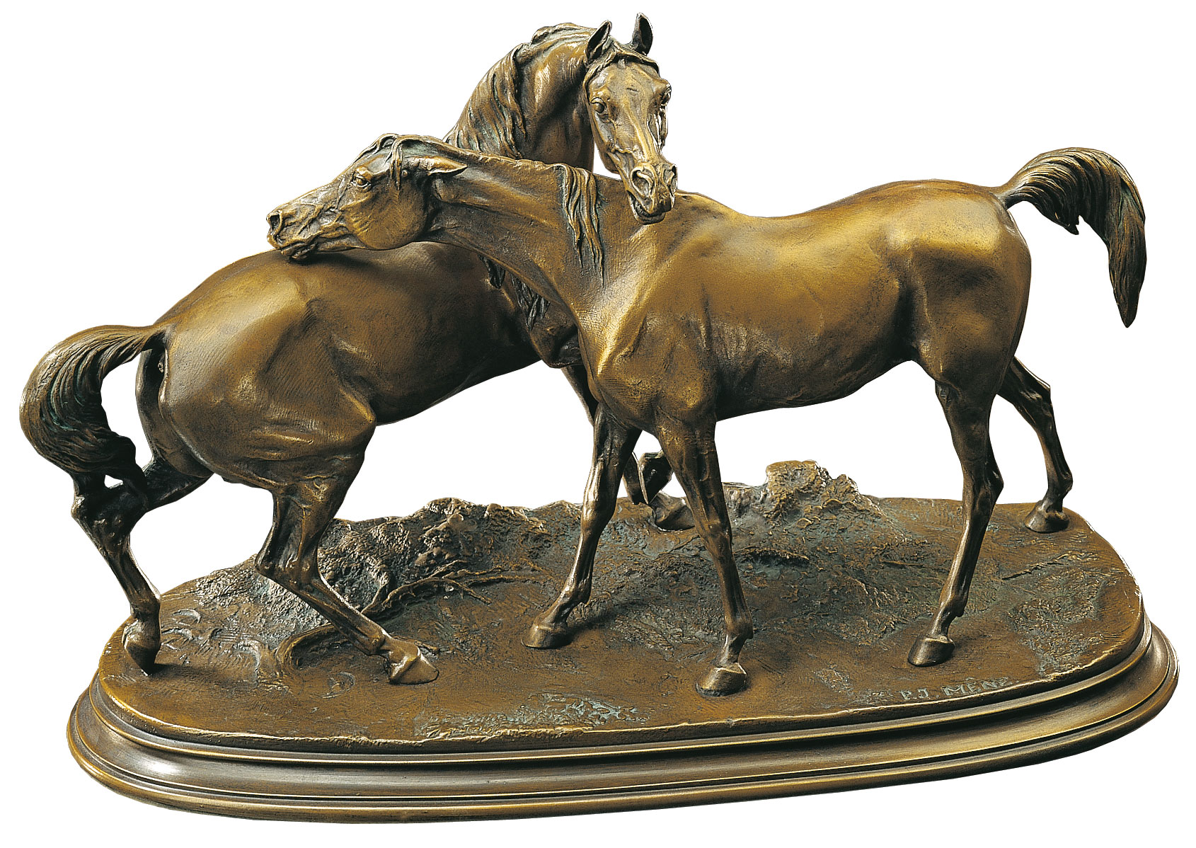 De Franse dierbeeldhouwer Pierre Jules Mêne is een van de meest opmerkelijke vertegenwoordigers van de 'Animaliers' groep beeldhouwers. Zijn beeldengroep, waaraan hij de titel 'Omhelzing' gaf, is een van de mooiste, gevoeligste en bekendste paardenbeelden die we kennen. De genegenheid van het edele paar paarden, een Arabische hengst en een Arabische merrie, wordt gevisualiseerd in een dynamische, speelse beweging. Polymeer ars mundi museum replica met de hand gegoten en met de hand gepatineerd. Afmeting 55 x 36 x 21 cm. Gewicht ca. 30 kg.