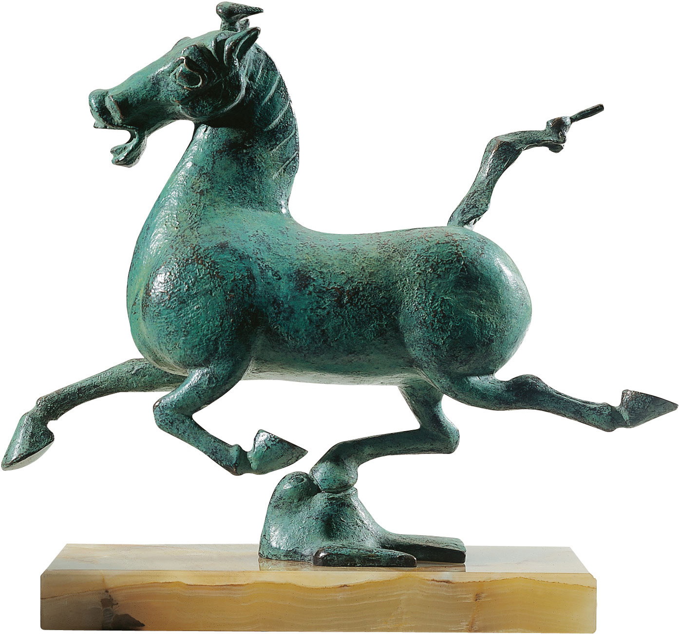 Vol trots lieten de edelen hun paarden afbeelden op de reliëfs van hun graven of als bronzen afgietsels. Toen Chinese archeologen in 1969 het graf van een Han generaal bij Wuwei in de provincie Gansu langs de oude Zijderoute openden en dit paard ontdekten, waren ze ademloos door het grandioze werk. Het is nu een van de meest waardevolle kunstschatten ter wereld. De figuur balanceert op een zwaluw, die verbaasd zijn hoofd draait. Origineel: Paleismuseum, Beijing. Han-dynastie, 25-220 n.Chr. Gemaakt van brons met behulp van de verloren wastechniek en met de hand gepatineerd. Afmetingen. Afmetingen sculptuur: 27 x 30 x 7 cm (h/w/d). Marmeren sokkel van 3 x 22 x 12 cm (h/w/d). Gewicht 5 kg.