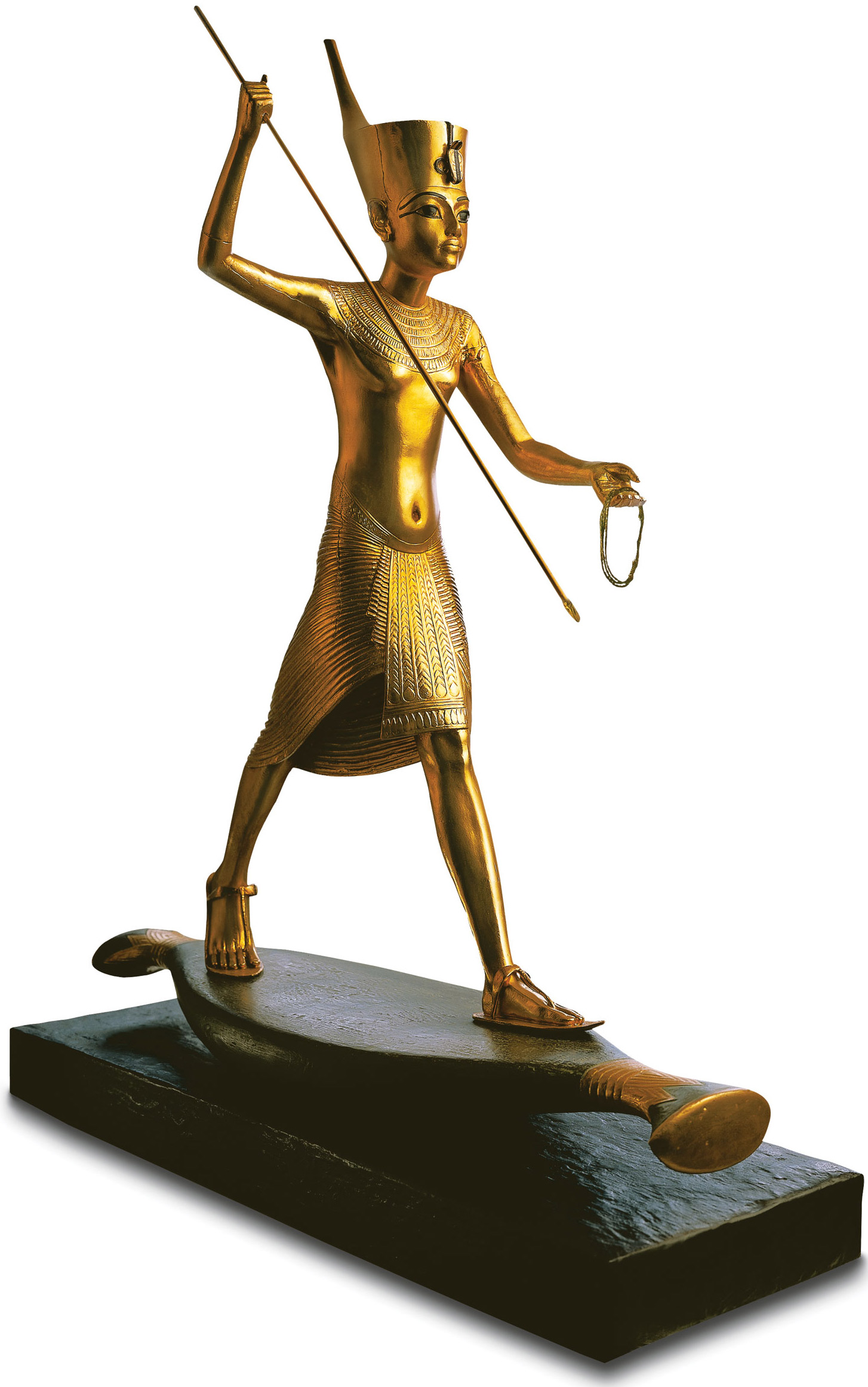 Als verdediger van interne en externe veiligheid doodt de koning de vijand van de mens en de goden. Hij staat sierlijk op de lichte papyrusslang. De sprong en de opgeheven arm tonen het moment van de hoogste spanning, vlak voordat de harpoen toeslaat. Egypte, Nieuw Koninkrijk, 18e dynastie, ca. 1335 v.Chr. Origineel: Egyptisch Museum, Caïro, Schat van Toetanchamon Met de hand verguld, polymeer model van beeldhouwer. Hoogte inclusief papyrusslang en houten basis 82 cm.