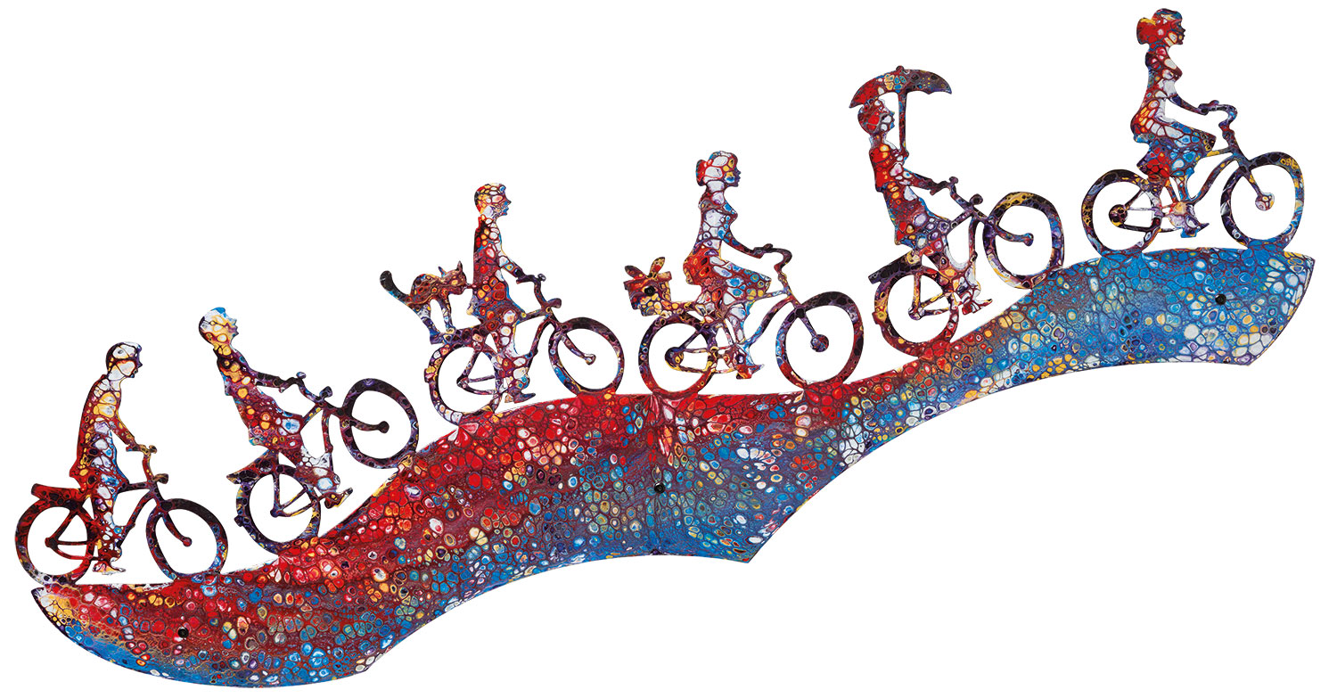 In de wandsculpturen zijn alleen de silhouetten van de motieven herkenbaar. De oppervlakken van de muurobjecten tonen verder geen details van het motief, maar zijn bedekt met abstracte, kleurrijke en schijnbaar willekeurige patronen van acrylverf. Het contrast tussen het gedefinieerde, figuratieve silhouet en de surrealistische kleurenzee creëert een unieke en spannende esthetiek. Het uitgebreide productieproces begint altijd met handgetekende schetsen. Op basis hiervan worden de contouren van het motief met een laser uit het metaal gesneden. Deze blanco wordt gegrond en vervolgens beschilderd met acrylverf. Tot slot wordt de kleur met een leren doek uitgesmeerd en wordt het oppervlak kort met een vlam verhit om kleine onregelmatigheden en luchtbelletjes te creëren. Door deze bewerkingsstappen is het resultaat altijd onvoorspelbaar en wordt elk object een uniek stuk met een unieke vorm en kleurstructuur - of het nu een uitstapje naar het platteland of een stedentrip is, het is altijd een vrolijk en kleurrijk uitstapje. Kunstig vervaardigd stalen wandobject. Afmeting 38 x 116 x 1 cm (H/W/D). Gewicht 3,7 kg. Met ophangsysteem en afstandhouder.