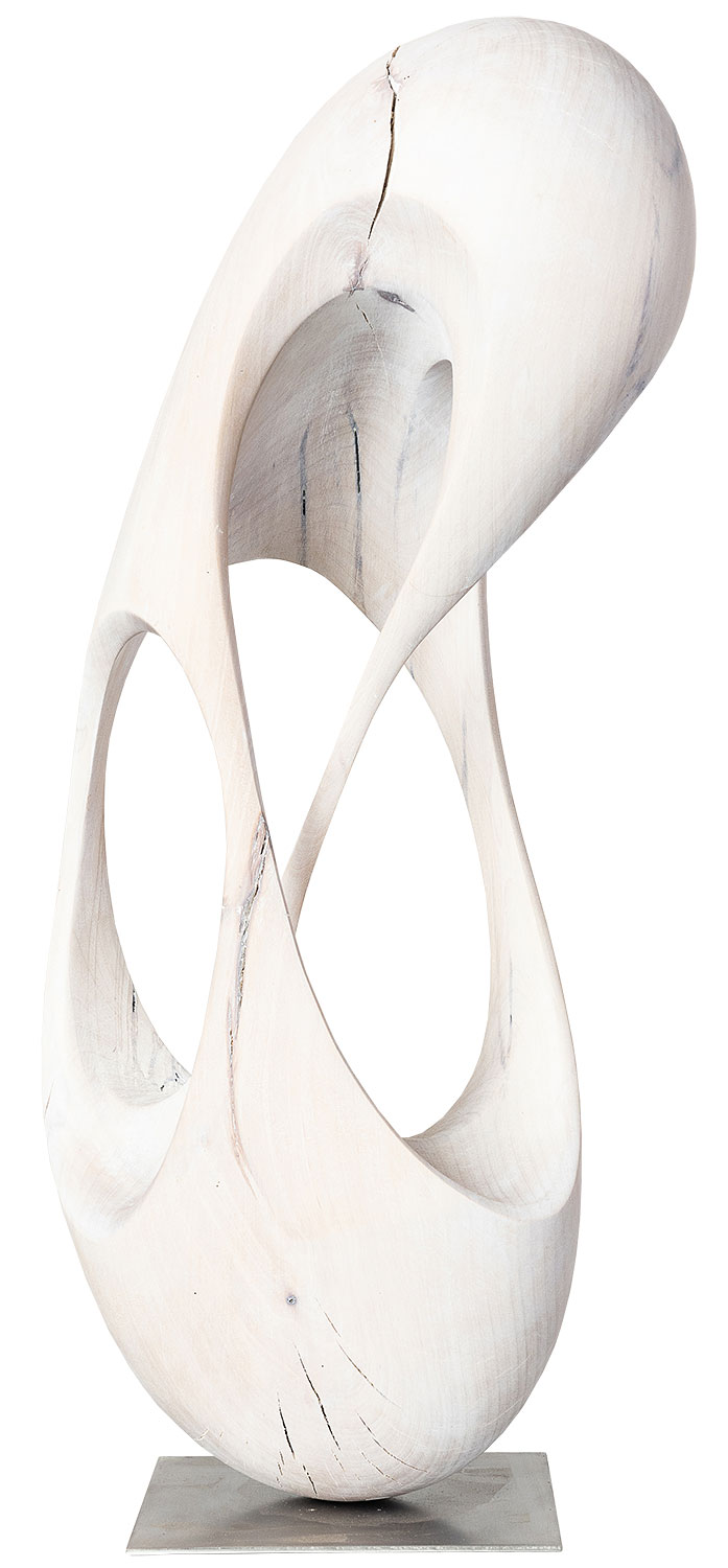 Sculptuur gemaakt van berkenhout, gesneden uit een blok. Gesigneerd. Gemonteerd op een stalen plaat. Afmeting 62 x 29 x 13 cm (h/w/d). Gewicht 4,6 kg.
