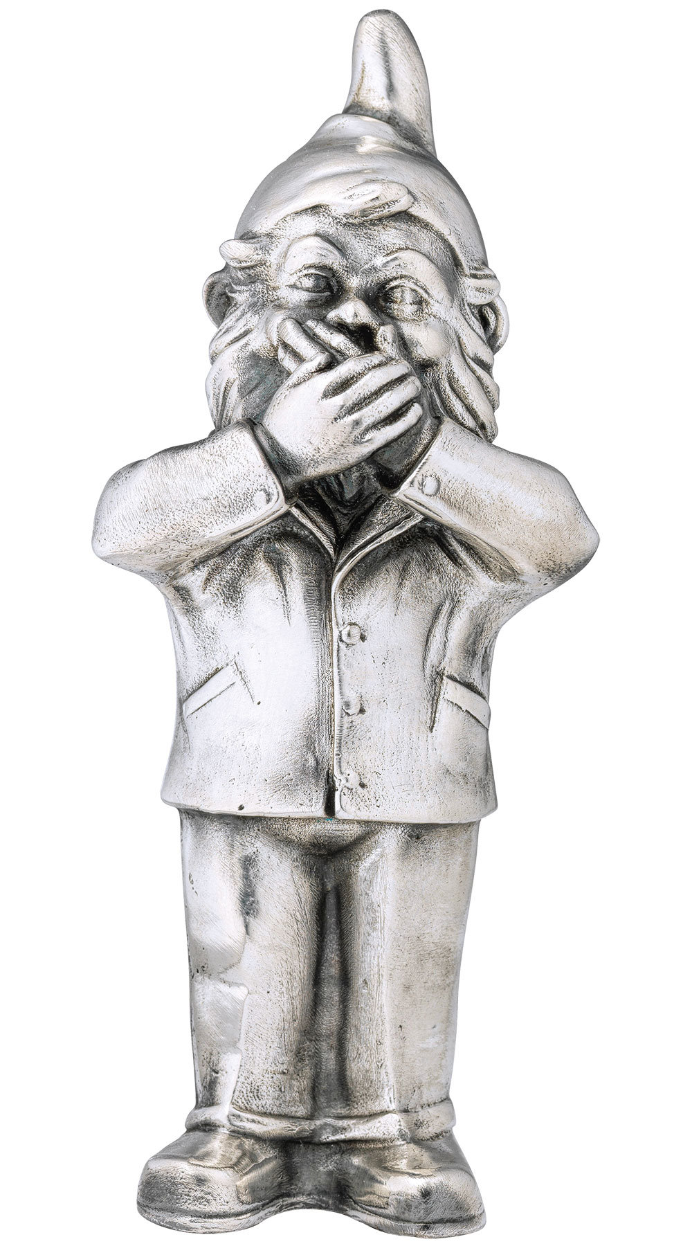 1.200 Zwerge in den Farben schwarz - rot - gelb und den drei Haltungen 'nichts sehen - nichts hören - nichts sagen' wurden eigens für die Kunstmesse art Karlsruhe 2006 konzipiert. Prof. Hörl sprach von einer 'sanften Provokation', gerade in der Stadt des Rechts, und seine Zwergen-Parade, auf einer riesigen Holzkonstruktion im Rechteck aufgebaut, werden gewiss zum Schmunzeln geführt haben. Die 'relativ politische Idee' (Hörl), die von jedem Betrachter nach Gutdünken interpretiert werden kann, zeugt von einer Kunst, die die Auseinandersetzung sucht, die sich nicht im geschützten musealen Ambiente verkriechen mag. Signierte Sonderedition von 980 Exemplaren aus versilbertem Metallguss. Format ca. 16 x 7 x 4 cm (H/B/T). Gewicht ca. 1,3 kg. ars mundi Exklusiv-Edition.