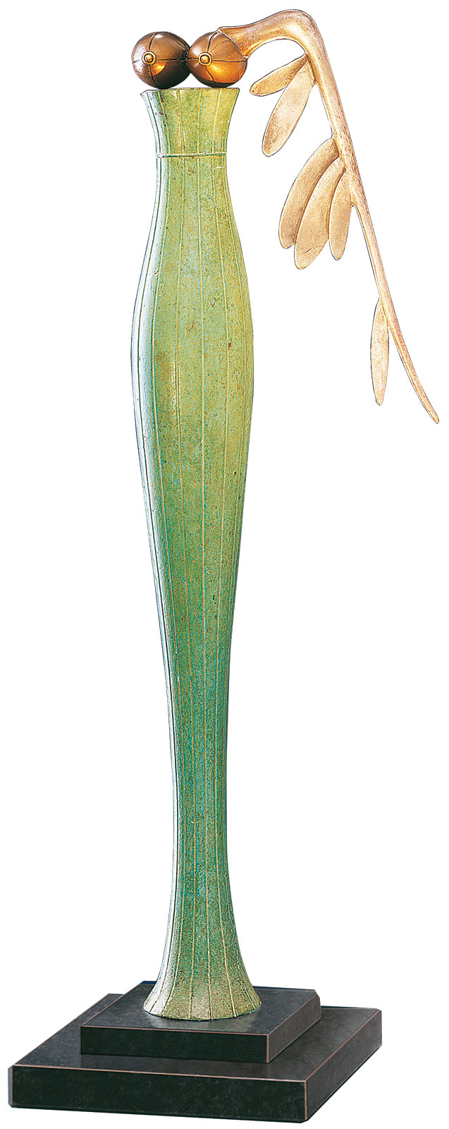 Eine besondere Schlüsselrolle im Werk Paul Wunderlichs stellen seine mythologischen Objekte dar. Mit seiner Skulptur 'Geflügelte Nike' beweist er erneut seine große Meisterschaft. Unverkennbar abstrahiert er die wesentlichen Elemente und fügt sie zu einer einzigartigen Komposition aus Linien und geometrischen Formen zusammen, die Erotik und Sensualismus ausstrahlen. Ein großartiges Spätwerk eines großen Meisters. Skulptur in feiner Bronze, von Hand gegossen im Wachsausschmelzverfahren. Von Hand mehrfarbig patiniert in den Farben grün, schwarz, silber und bronze. Limitierte Weltauflage 360 Exemplare, nummeriert und signiert. Gesamthöhe 41 cm, montiert auf einer Bronzeplinthe im Format 12 x 12 cm. Gewicht ca. 2,5 kg.