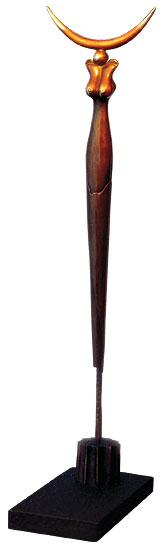 Die Skulptur Mondsichelstele, antiken Idolen verwandt, bewegt sich zwischen Archaik und Moderne. Ihr Zauber und die Imagination, die sie in uns erweckt, entführen uns in die Welt der Mysterien. Wenn Wunderlich dem schlanken, eleganten, weiblichen Torso eine Mondsichel zum Attribut gibt, folgt er - neben formalen Überlegungen - auch der gewollten Anspielung auf Luna, die Mondgottheit. Vielleicht muss man, wie Joachim Kaiser über Wunderlich sagt, selber ein wenig von jenem Perfektionswillen besessen sein, alles auf den (ästhetischen) Wahrheitspunkt zu bringen, um ermessen zu können, wie viel Tiefgründigkeit in der eleganten Form dieser Skulptur mitschwingt. Skulptur in Bronze 1994, patiniert, teilweise poliert. Gegossen im Wachsausschmelzverfahren. Höhe der Skulptur 40 cm. Montiert auf einer Bronzeplinthe 13 x 7 x 1,5 cm. Gewicht 1,2 kg. Auflage 1.250 Exemplare, nummeriert und signiert. Werknummer 238.
