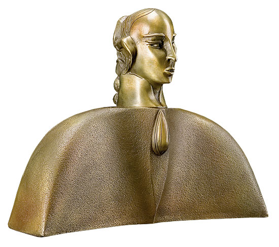 Nähert man sich der Skulptur frontal, blickt man in ein Gesicht, das seinem Betrachter interessiert und konzentriert zugleich entgegenblickt. Der schlanke Kopf sitzt auf der halbmondförmigen Schulterpartie, die in der Mitte durch ein stilisiertes Jabot optisch geteilt wird.Die Skulptur besticht durch ihre reduzierte und scheinbar schlichte Form, lässt aber im Detail Symbolhaftes erkennen: Ein Dreieck gliedert den Rücken der Figur und ist das Zeichen der Freimaurerei, deren Idee der Toleranz Mozart in seiner Zauberflöte thematisiert. Wunderbar ist der Kontrast zwischen dem barockisierten Kopf und dem reduzierten Korpus. Die Bronzeoberfläche ist teils strukturiert, teils glatt poliert, hat einen goldenen Schimmer und unter streicht das Edle und Erhabene des Genies.Skulptur in Bronze, patiniert, teilweise poliert. Gegossen im Wachsausschmelzverfahren. Limitierte Auflage 60 Exemplare, nummeriert und signiert. Höhe 22 cm, Breite 29 cm. Gewicht 4 kg.