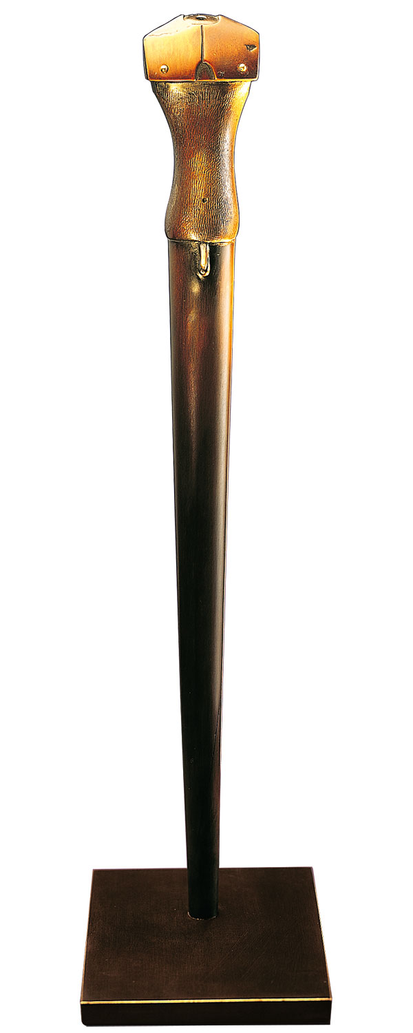 Beherrschendes Element der Stele des Hermes ist der Säulenschaft, der nahezu Zweidrittel der Skulptur ausmacht. Eine feine Linie unterbricht die mathematischmetallische Glätte des Schafts und windet sich in großzügigem Schwung nach oben. Es folgt der ausgebildete, stark stilisierte Torso. Ein kühner S-förmiger Linienschwung zwischen Schulterblatt und Hüfte löst die archaische Statuarik auf und erfüllt die Skulptur mit Leben.Skulptur in feiner Bronze, patiniert, teilweise poliert. Werknummer 285. Von Hand gegossen im Wachsausschmelzverfahren. Limitierte Auflage 1.250 Exemplare, nummeriert und signiert. Höhe der Skulptur 39 cm. Montiert auf einer rechteckigen Bronzeplinthe von 13 cm Länge. Gewicht 2,2 kg.