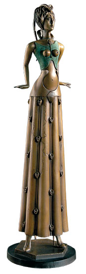 Einen Klassiker der Gegenwartskunst hat Paul Wunderlich mit seiner 'Tänzerin im Blumenkleid' geschaffen. Erst nach und nach entdeckt man die zahlreichen Details: das Korsett, den Halsschmuck, die phantasievolle Frisur und natürlich das mit Calla-Blüten besetzte Kleid. Jede Einzelheit fügt sich in den Zusammenklang zur großen Form. Es ist das Sublime, das Erhabene, das Wunderlichs Tänzerin so unvergleichlich macht. Auch dem Bronzegießer wurde all sein Können abverlangt: 'Dies ist einer der kompliziertesten Güsse, die ich je gemacht habe.' Skulptur in feiner Bronze, von Hand gegossen im Wachsausschmelzverfahren. Von Hand patiniert und poliert. Höhe 56 cm, Gewicht 7,5 kg. Auflage: 390 Exemplare, nummeriert und signiert.