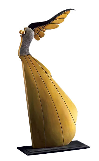 Victoria fasziniert durch die Einfachheit der Form, die mit einem Blick zu erfassen ist. Bei näherem Hinsehen aber bemerkt man, wie überlegt jedes Detail gestaltet wurde. Der wehende Rock zeigt das Vorwärtsdrängen der Skulptur an. Seine gewölbte Oberfläche wird durch die Konturen und drei Gewandfalten lebendig. Während die vordere Kontur des Rocks gerade, jedoch leicht geneigt, nach unten verläuft, ist die hintere Kontur in sanften Schwüngen gegliedert. Der Glätte des Gewandes schließt sich die geperlte Oberfläche des Mieders an, akzentuiert durch die Geometrie des Busens. Und dann der Flügel: beachtenswert ist, wie differenziert Wunderlich die Federn anordnet, um auch hier eine Form zu finden, die von den üblichen Darstellungen abweicht. Und auch die Farbigkeit: das Gold des Rocks und des Flügels, in dem das Licht der Umgebung reflektiert, das Schwarz der Plinthe und der Flügeloberkante, das die Skulptur nach unten und oben begrenzt, und das zurückgenommene Graubraun des Oberkörpers, sind weitere Elemente, die Skulptur zu differenzieren und gleichwohl, wie selbstverständlich, eine Einheit zu bilden. Mit ihrer Höhe von 77 cm ist Victoria eine stattliche Skulptur. Ihr Gewicht von 22 Kilogramm weist auf das beträchtliche Volumen hin. Skulptur in feiner Bronze 2008, patiniert, teilweise poliert. Gegossen im Wachsausschmelzverfahren. Montiert auf einer Bronzeplinthe 38 x 17 cm. Auflage 70 Exemplare, nummeriert und signiert. Höhe 77 cm. Gewicht ca. 22,5 kg.