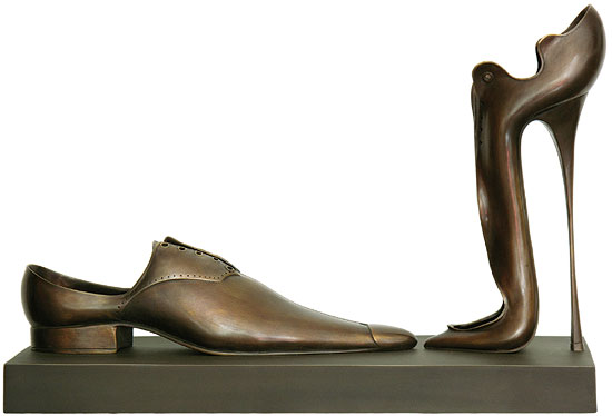 In Wunderlichs Skulpturengruppe 'A Deux' erfahren Dinge des täglichen Lebens eine Metamorphose im Zeichen des Eros. Die manieristisch überhöht dargestellten Schuhe werden zu Symbolen des männlichen und weiblichen Elementes. Durch ein Lederband miteinander verknotet, wachsen sie zu einer neuen gemeinsamen Wirklichkeit zusammen: Das Schuhpaar ist zugleich Symbol der Zusammengehörigkeit und des erotischen Fetisch.Skulptur in einer limitierten Gesamtauflage von 499 Exemplaren, aufgeteilt auf zwei Editionen. Edition in Bronze, von Hand gegossen. Von Hand patiniert und teilweise poliert. Nummeriert und signiert. WVZ-Nr. 101b. Maße einschließlich Plinthe: Höhe 30 cm, Länge 44 cm, Tiefe 18 cm. Gewicht ca. 11 kg.