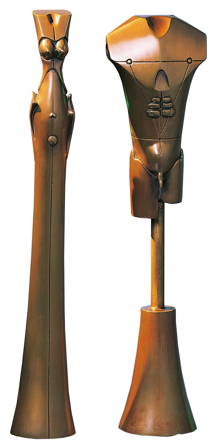 Werknummern 256 + 257. Zwei Skulpturen in Bronze, patiniert, teilweise poliert. Gegossen im Wachsausschmelzverfahren. Höhe jeweils 31 cm, Gewicht jeweils ca. 1,5 kg. Auflage 500 Exemplare, nummeriert und signiert.