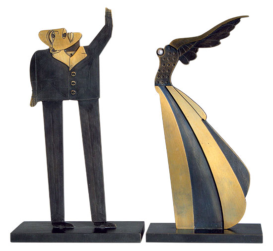 Wunderlichs fantasievolles Paar zeigt ihn als philosophischen Fragensteller, sie als Victoria im wehenden Gewand, als Siegesgöttin. Zwei Skulpturen in Bronze, montiert auf einer Bronzeplinthe, patiniert, teilweise poliert, gegossen im Wachsausschmelzverfahren bei Fritz Albrecht in Altrandsberg. Limitierte Auflage 280 Exemplare, nummeriert und signiert. Flügelfrau: Höhe 18 cm. Breite 9 cm. Fragensteller: Höhe 18,5 cm. Breite 10 cm. Gewicht je 0,6 kg.